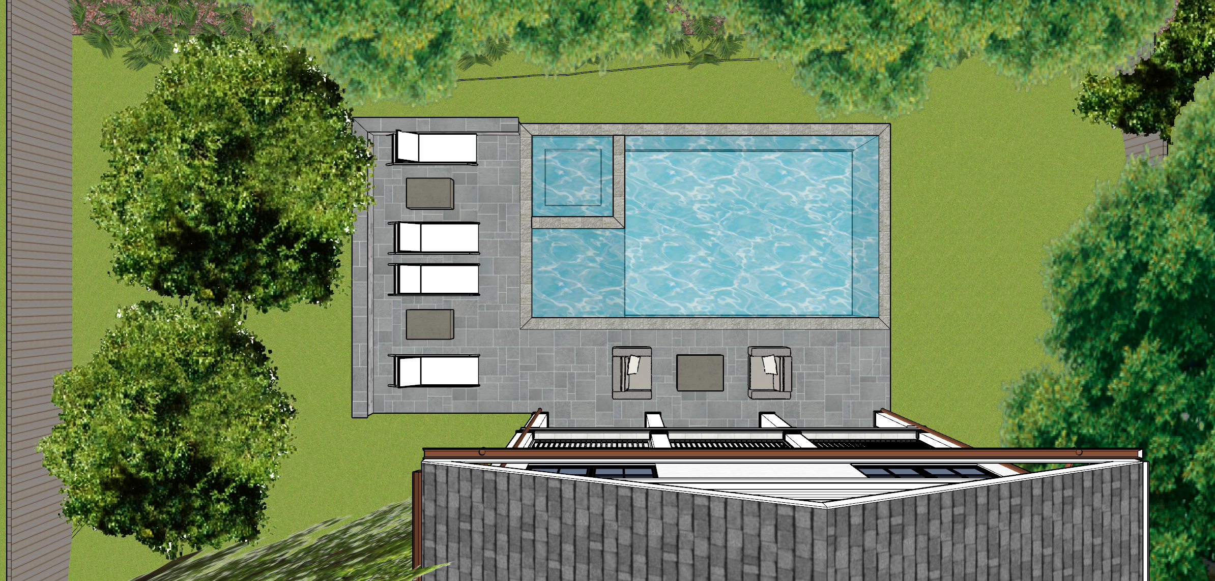 turn image to a realistic photo exterior ariel view looking down on house pool and trees
