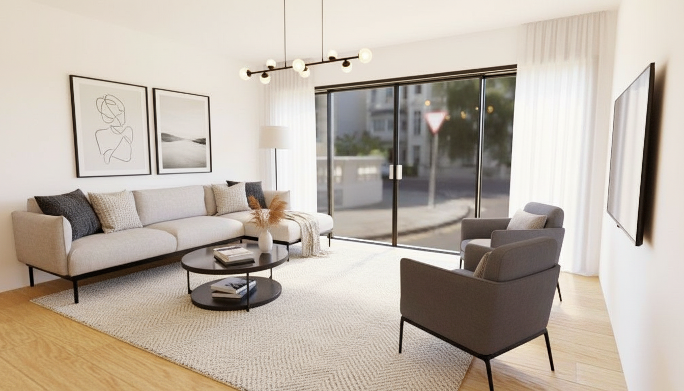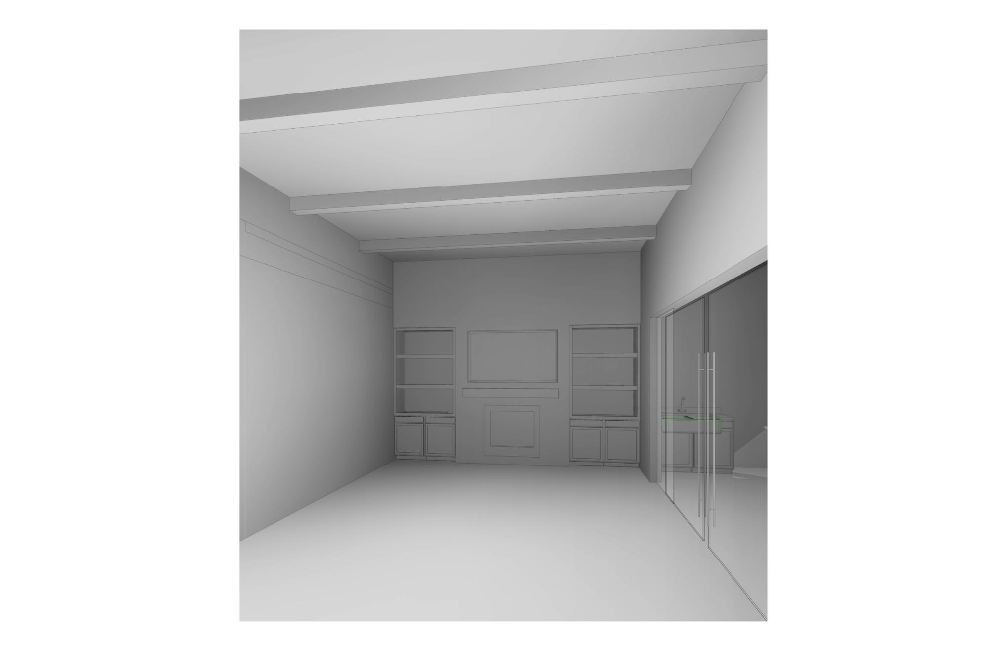 cabinets to be light wood tones flooring to be light wood tone walls to be soft white glass frame to be white