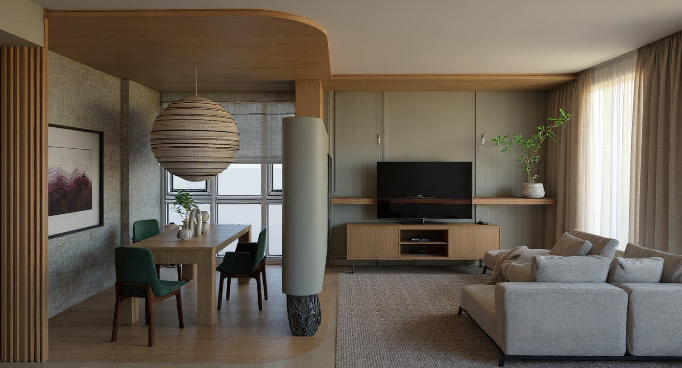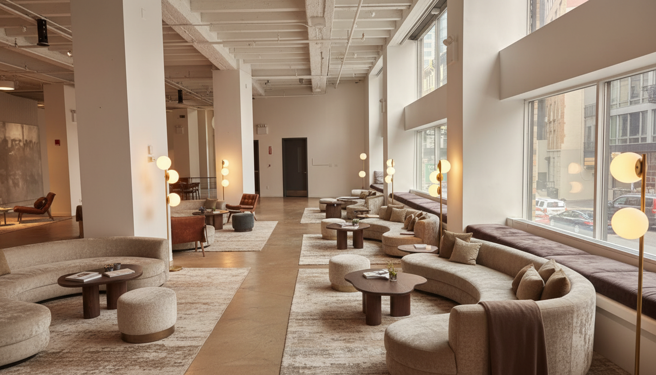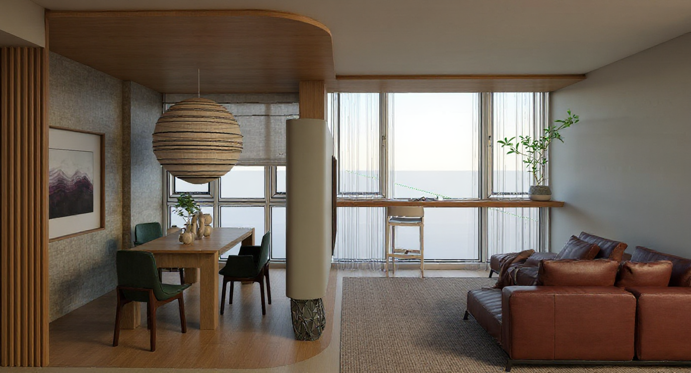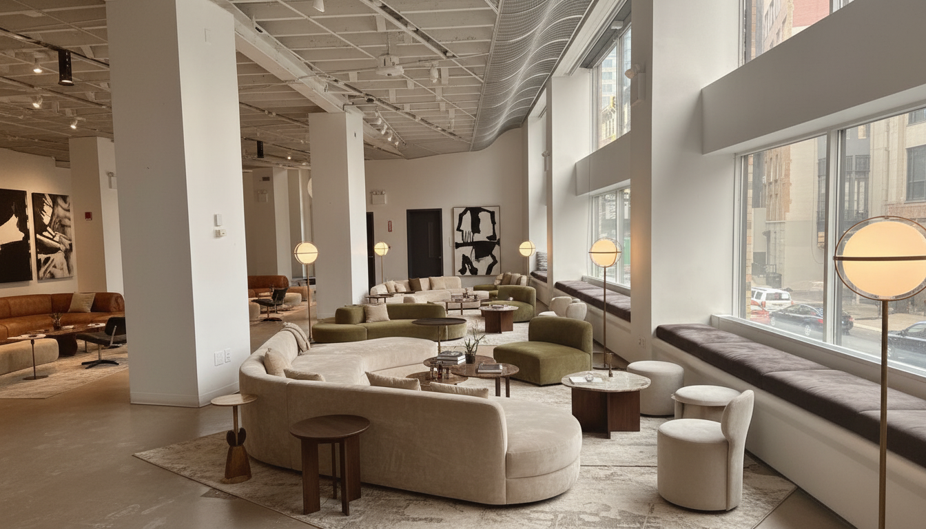 remove the window bench seating warm up the wood replace green with muted rust teracotta and worn in leather replace lighting with reference image lamps the space should feel warm 2200 kelvin do not take any liberties with the architecture or perspective retain the input photo s structure exactly sculptural accents punctuate the space do not change any existing architectural details and keep the existing floorplan and furniture
