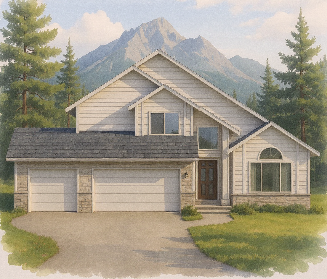 watercolor render of craftsman home with dark grey paint wood accents include trees and an alaska like environment in the background simple driveway and walkways in front of the home