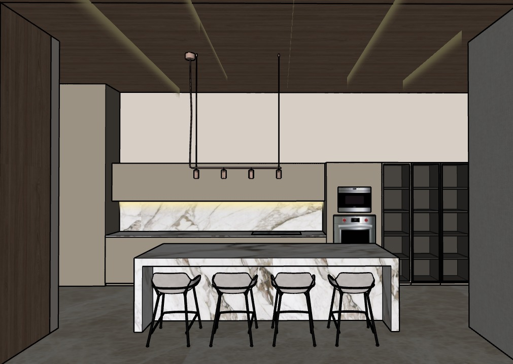 the cabinets are a smooth taupe brown shade melamine no windows floor is beige marble add rows of led lighting on the cieling cubbies on the right have smoke colored glass doors