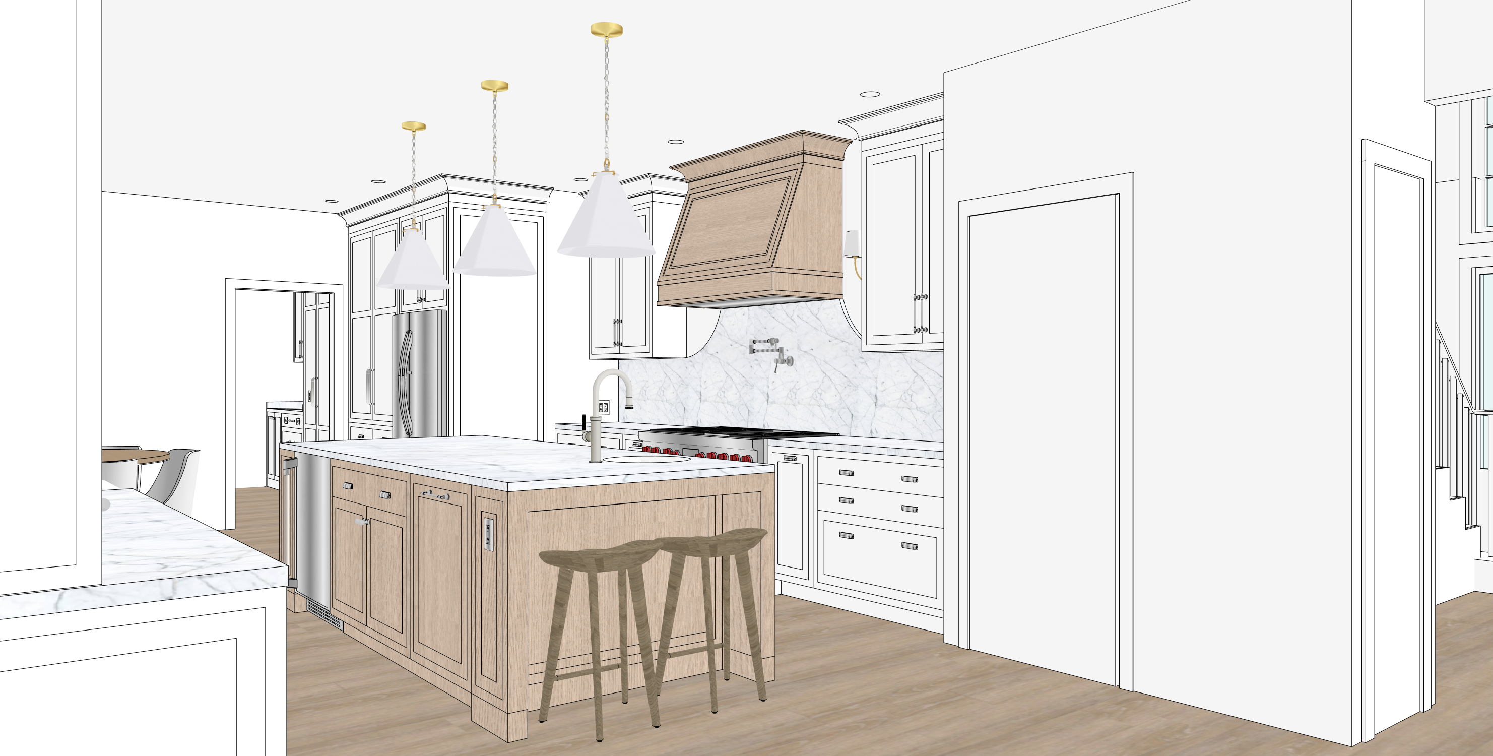 create a stunning bright kitchen the cabinetry and vent hood are in a light oak wood tone providing warmth and sophistication the countertops and backsplash are made of white marble with delicate gray veining adding a touch of luxury the island has a white marble countertop accompanied by two wooden bar stools stylish pendant lights with gold accents hang over the island radiating a soft ambient glow the flooring is light natural hardwood enhancing the airy atmosphere the atmosphere is bright and welcoming evoking a sense of elegance and contemporary charm