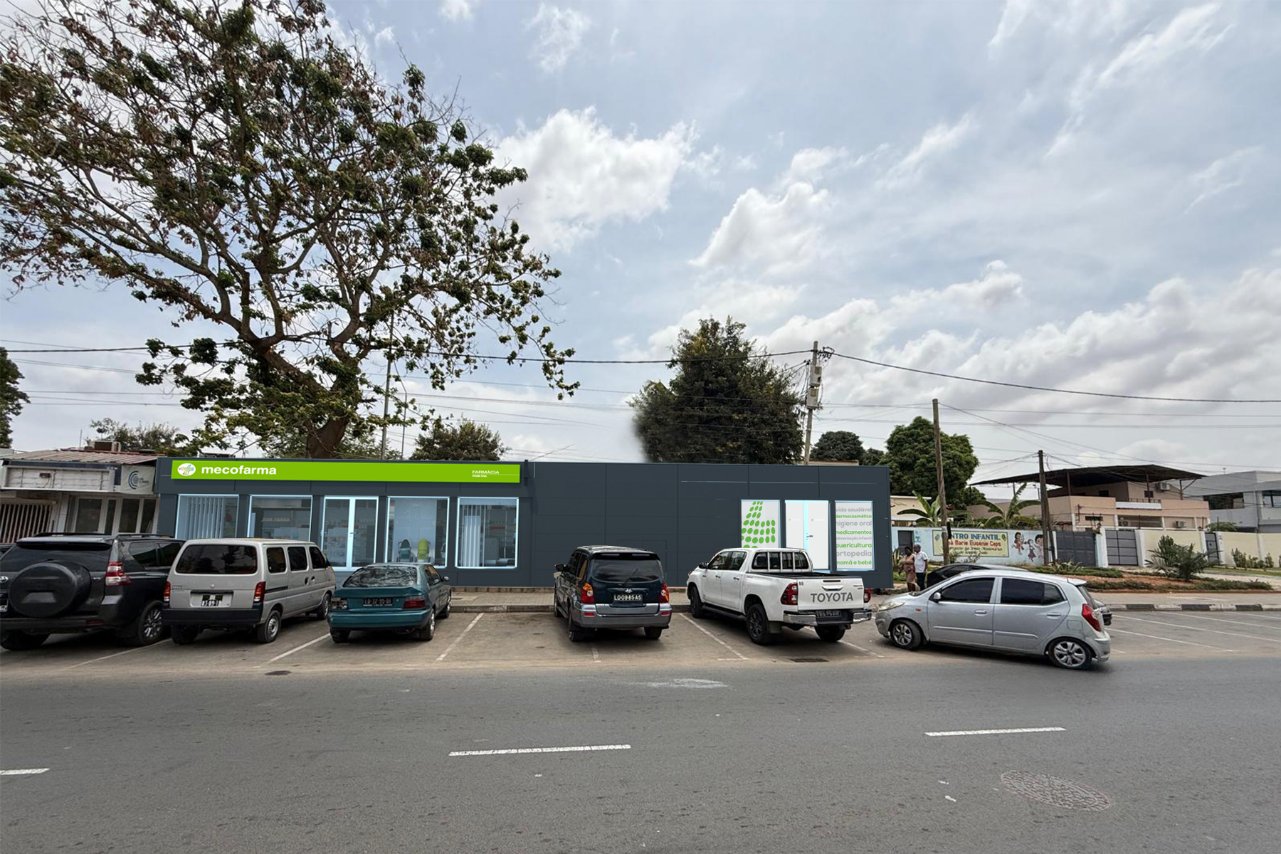 render a vibrant street scene featuring a modern pharmacy exterior the building facade is sleek with a bright eye catching neon green sign that contrasts with the sophisticated dark gray walls the foreground showcases parked cars each reflecting subtle metallic shades of black white and teal adding diversity to the scene in the background a majestic tree with lush green leaves stretches upward framed by a clear bright sky dotted with fluffy white clouds the atmosphere is lively yet serene capturing a sunny day with soft natural lighting that enhances the dynamic interplay of colors throughout the composition