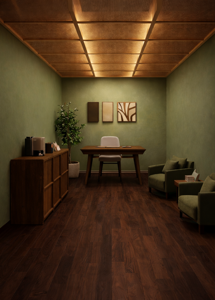 add more lighting to the ceiling add man in hat drinking cofee and working on macbook at the dest 18 months old baby boy walking around