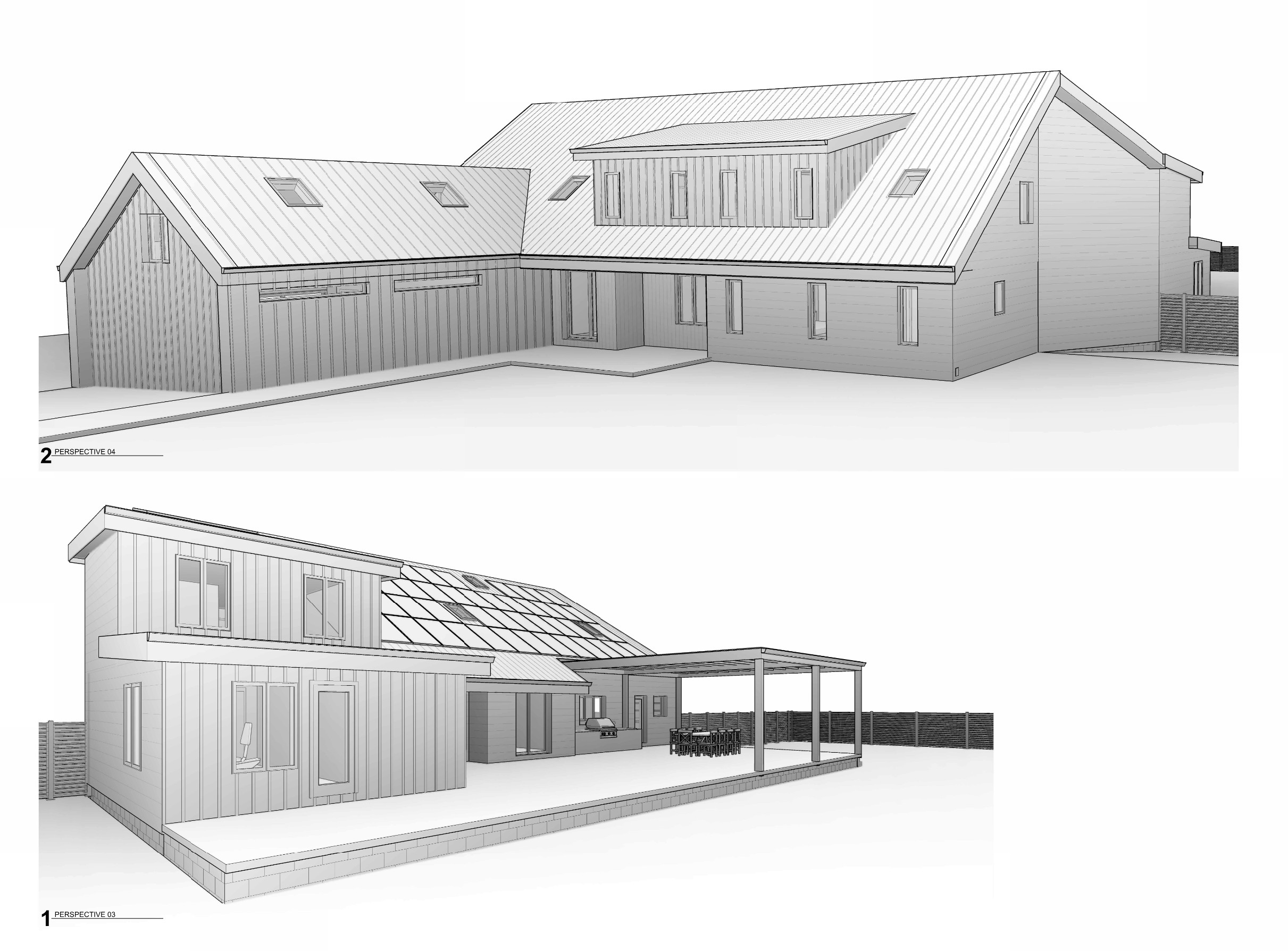 render a photorealistic 3d perspective of this house in a central ohio reference the current material style just enhance them charcoal standing seam metal roof white wood siding walls keep model geometry the same windows doors roof walls garage door pavement driveway make a lush vegetation that looks native to central ohio do not change the view only enhance the current materials and make the landscape nice vegetation detailed textures in the wood siding and glass reflections and a vibrant clear sky with light atmospheric depth render in hyper realistic architectural visualization quality 4k resolution make time of day a golden hour soft glow with sky having some gradient to orange and overall warm inviting image