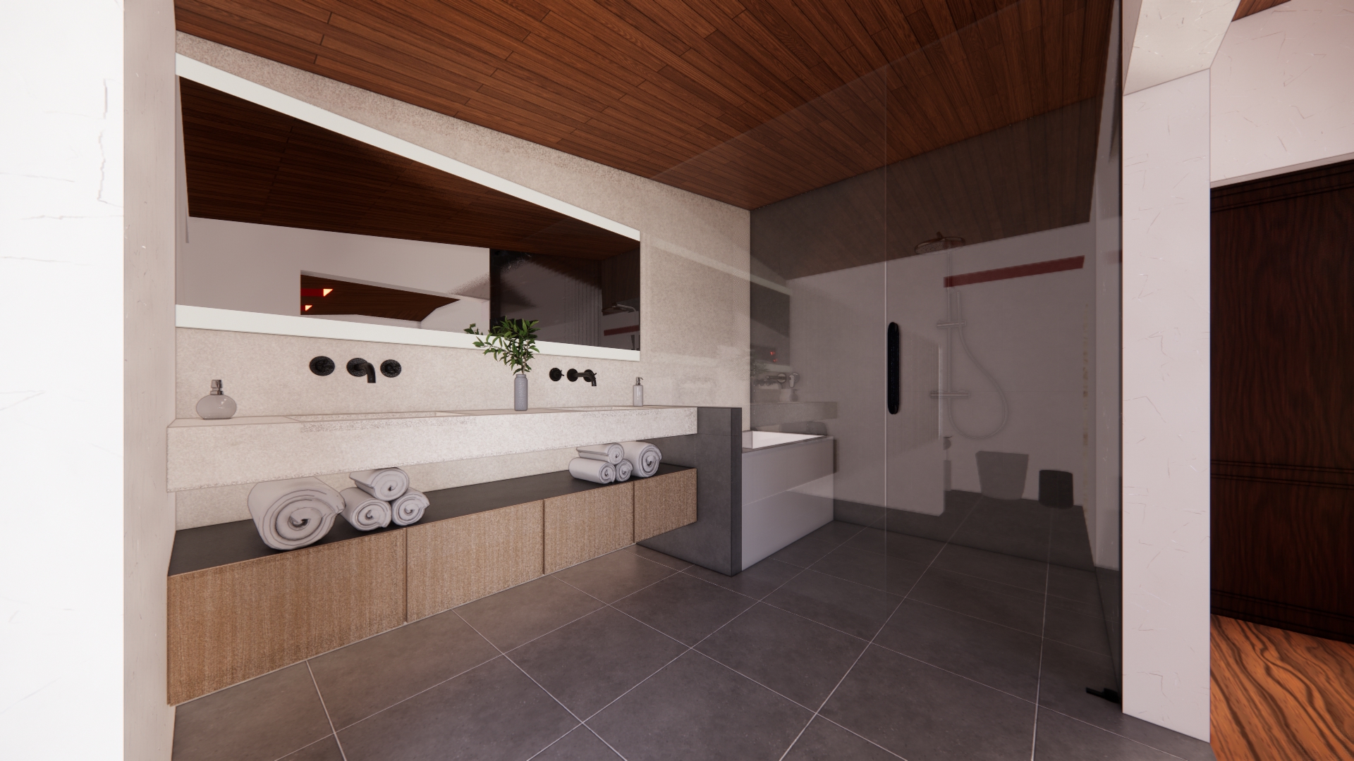 improve this bathroom render while keeping the existing layout add ceiling lighting for a bright and natural atmosphere enhance textures of walls flooring fixtures and furniture for a realistic and high quality appearance ensure the glass elements are clear and transparent realistic materials soft shadows and lifelike lighting