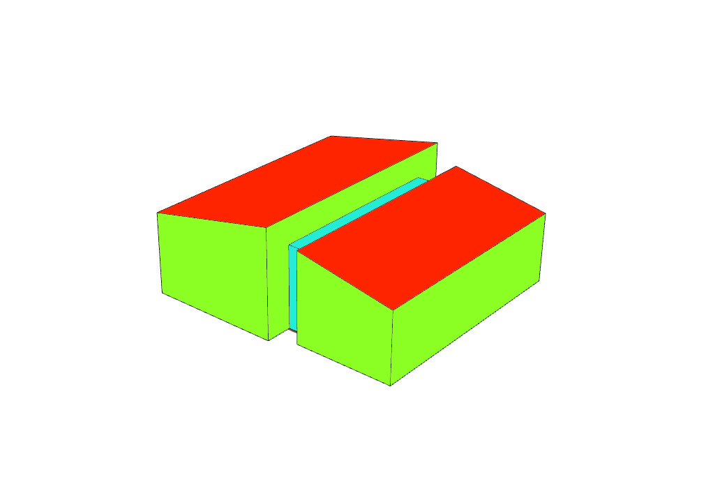 perspective shot tiled roof where it is red stone facade where it is green glass portions where it is cyan setting in the countryside architecture