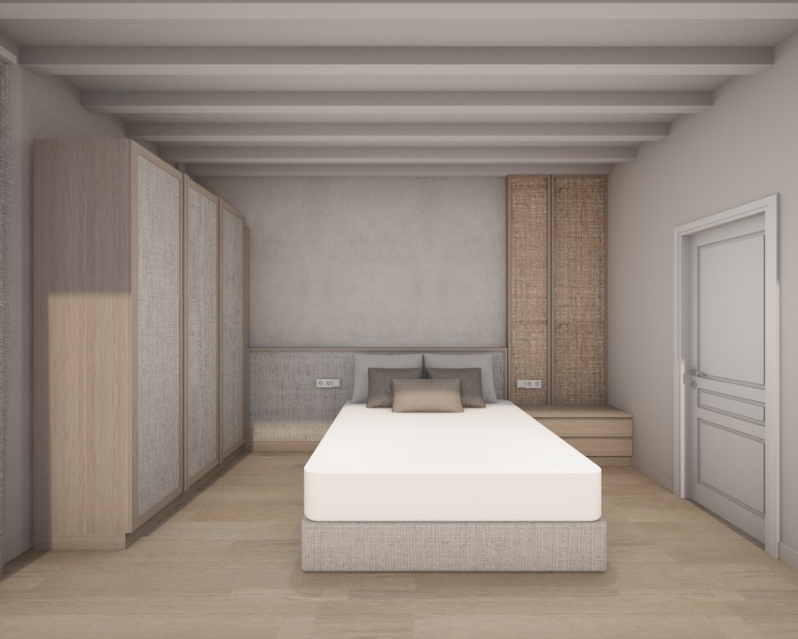 create a highly realistic render of an interior bedroom with a calm and serene atmosphere the headboard is upholstered in a white beige linen fabric creating a soft and elegant focal point on the right side the tall headboard section features a luxurious rattan texture the bed is dressed with perfectly ironed impeccably arranged bedding and pillows styled like in a five star hotel the sheets and duvet are crisp smooth and completely wrinkle free the two back pillows are in an off white tone the middle pillows are in a taupe beige shade and the front decorative pillow features a light beige linen fabric adding texture and depth through layered styling the bedside table on the left has a polished cement texture in a beige tone while the one on the right is made of light oak wood on the right side of the bed there are pendant lights exactly like the reference photo ultra realistic render high resolution interior design magazine photography style keep the initial design and layout of the space the lighting should be natural but neutral allowing all materials to appear clear and accurate fabrics wood rattan and all other textures must look clean crisp and true to their real colors without color distortion or heavy shadows all materials should be clearly visible well defined and perfectly clean