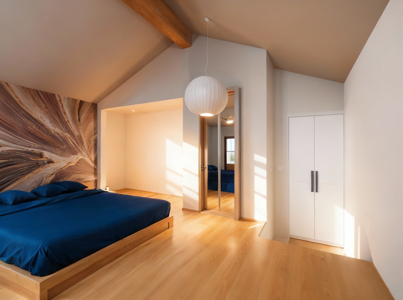 a warderobe with an oak knot free flooring and oak cabinets the stickwall in dehte background to the floor