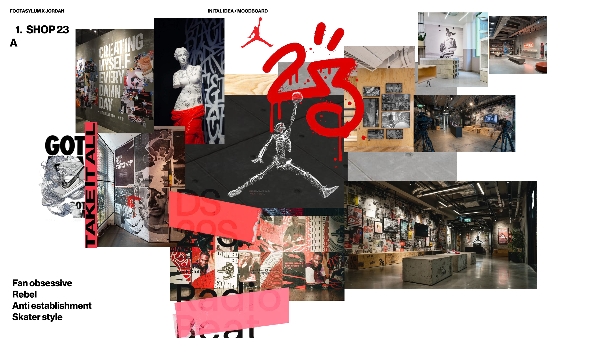 basement retail space for jordan with a staircase down from ground floor that turns through 90 degrees at the base 5 steps approximately 10m x 10m ensure heavy jordan branding no people shop 23 medium to high level of merchandise sneakers and apparel paste up layers stickers tape graphics neon handheld work lights milk crates temporary stacks designed to look built overnight content reactive viral lo fi fast paced content live reactions first person raw momentum meme friendly remixable