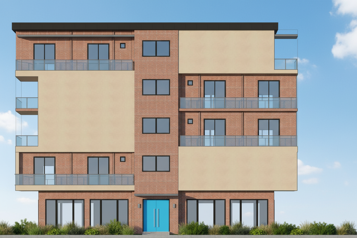render a modern apartment building with a warm and inviting atmosphere use deep red brick for the building fa ade sand colored concrete for the central sections and dark gray for the roof the windows are large with sleek black frames and the balcony railings are made of frosted glass the main entrance door is a vibrant blue the scene is set during golden hour casting a soft warm light across the building enhancing the textures and colors lush green trees and plants surround the building adding a touch of nature and tranquility