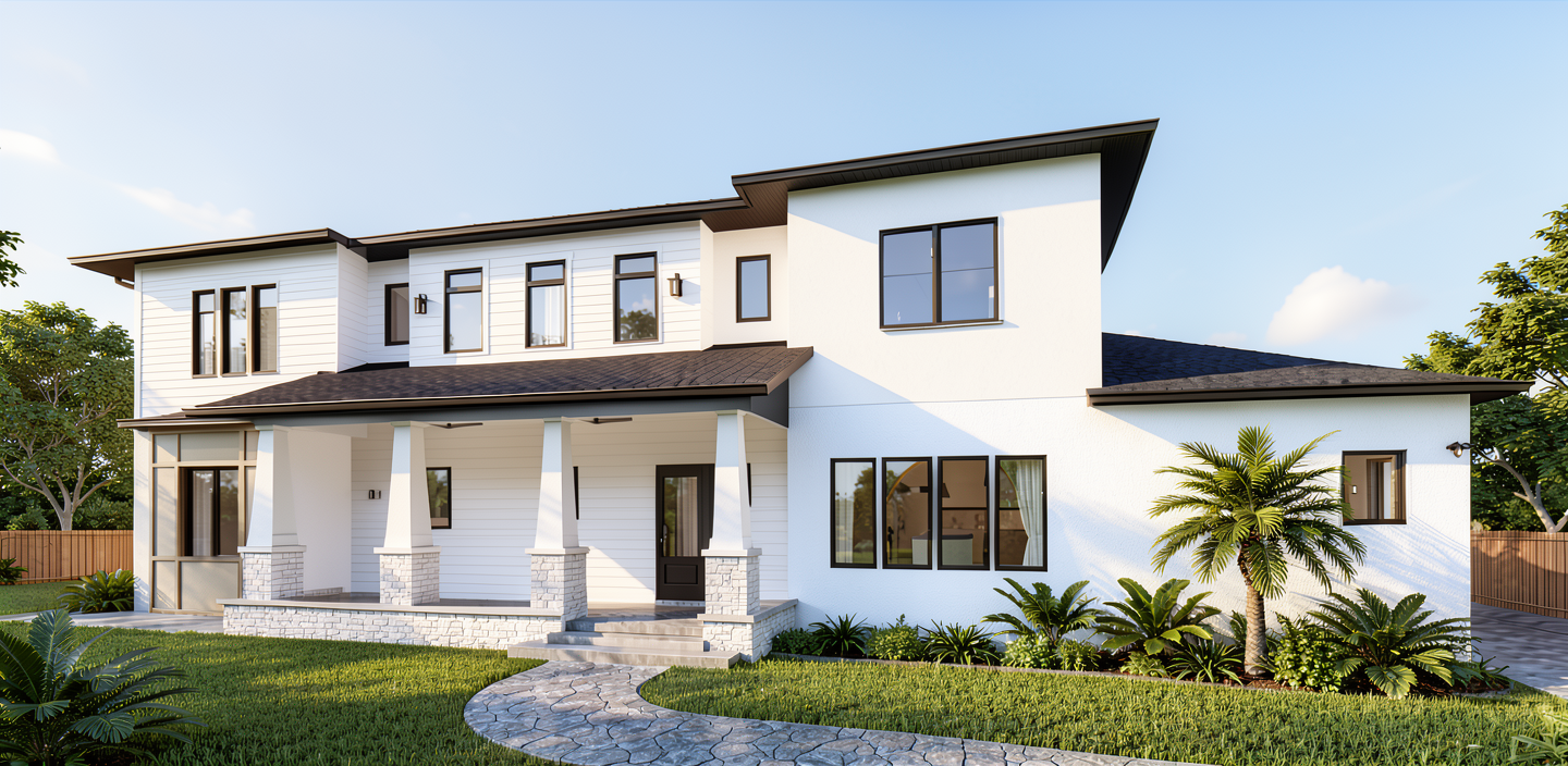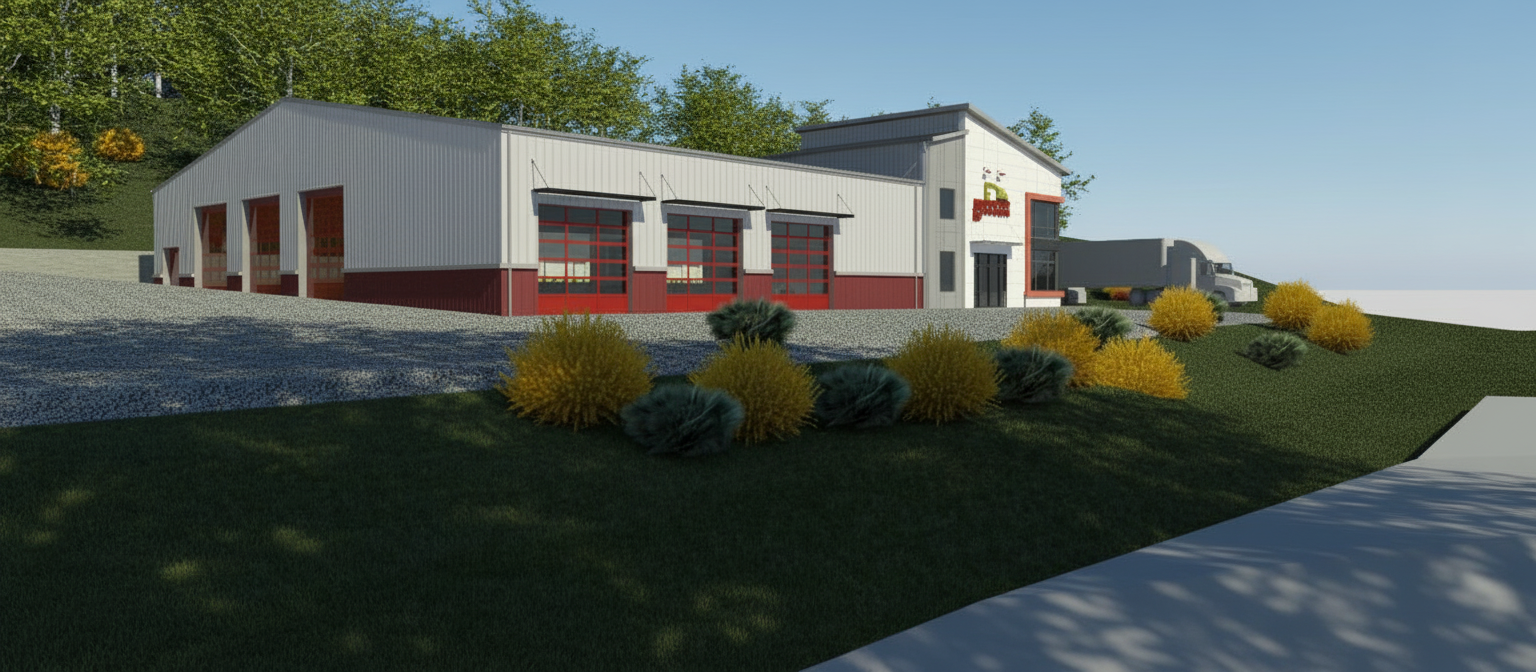 render a beautifully detailed industrial building set in a natural environment the building features a modern white facade with red accents on doors and windows surround the building with rich greenery incorporating lush dark green shrubs alongside vibrant yellow bushes the sky is clear with soft sunlight casting gentle shadows creating a peaceful atmosphere the ground is covered with a mixture of dark green grass and grey gravel in the background include dense leafy trees in shades of green to add depth and contrast to the scene sleek cable stayed from above metal black roof and canopies over some garage doors and entry door semi delivery truck on the far side of the building