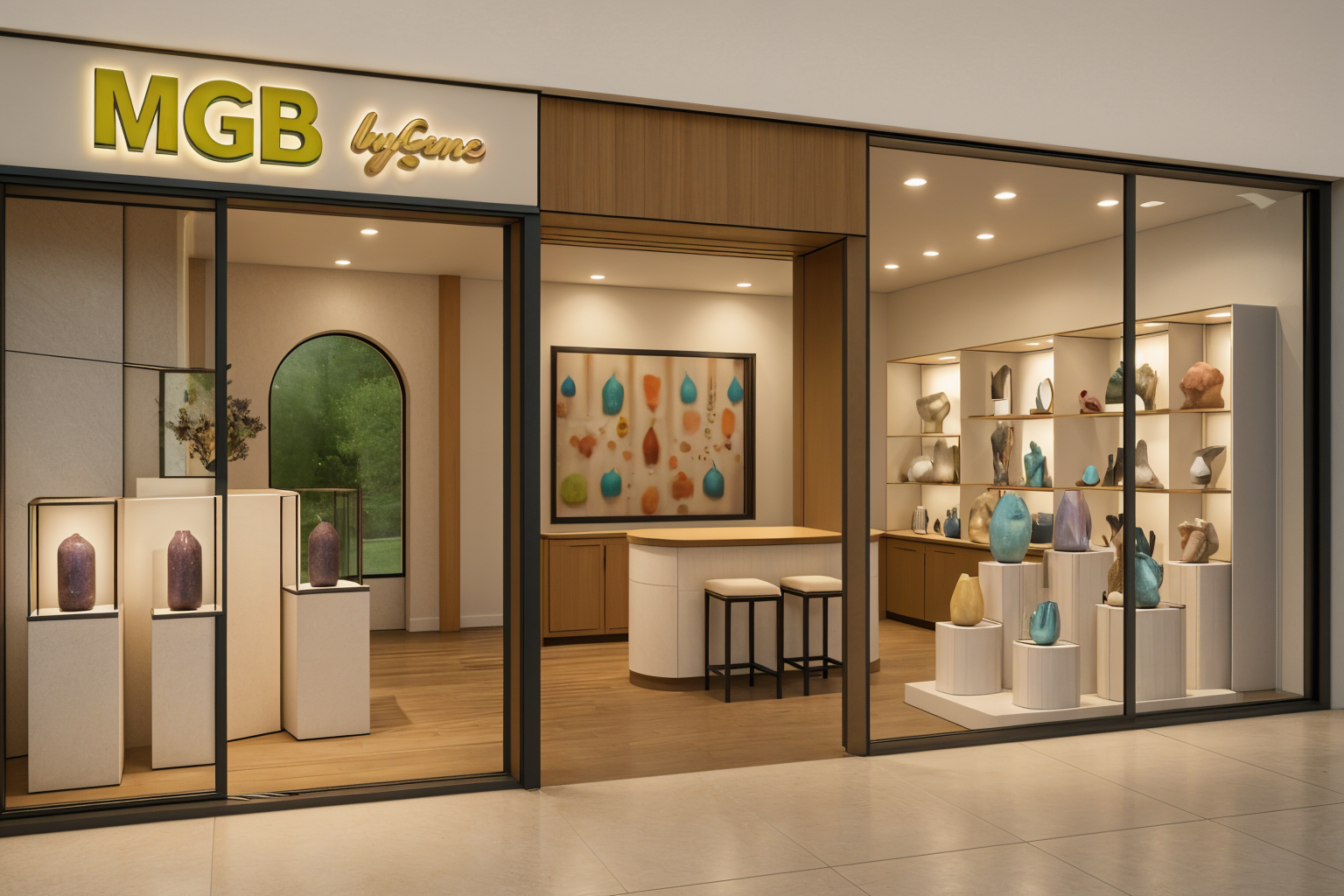 wide angle shot crystals on display shelves gems on display shelves mirror on wall ceiling with lights maintain colors wood counter cabinets glass jars with gems no lid