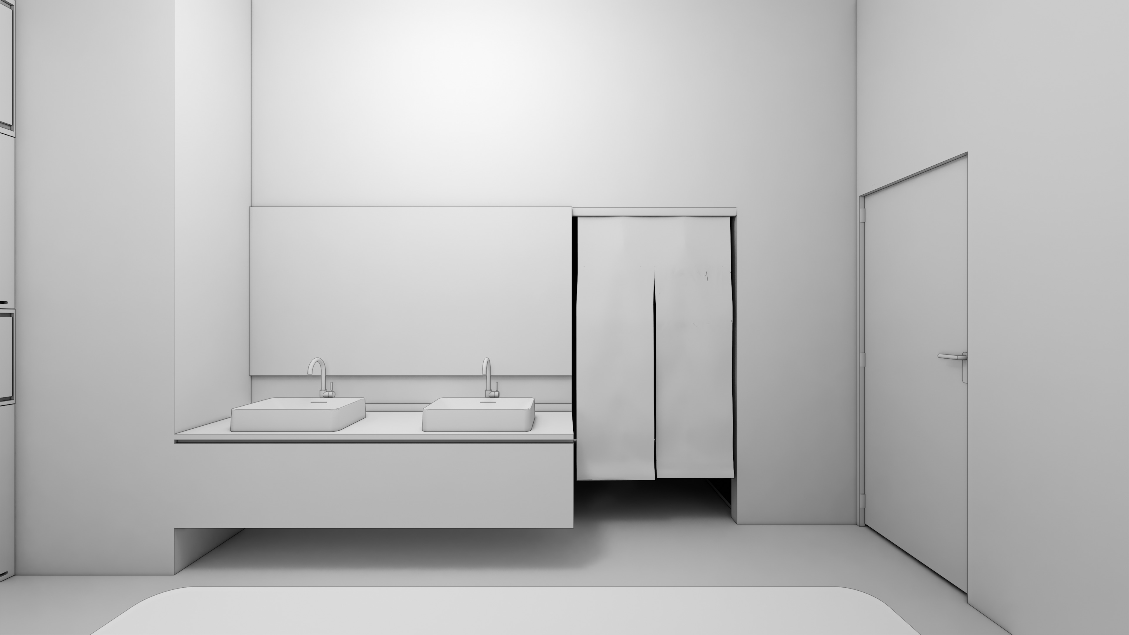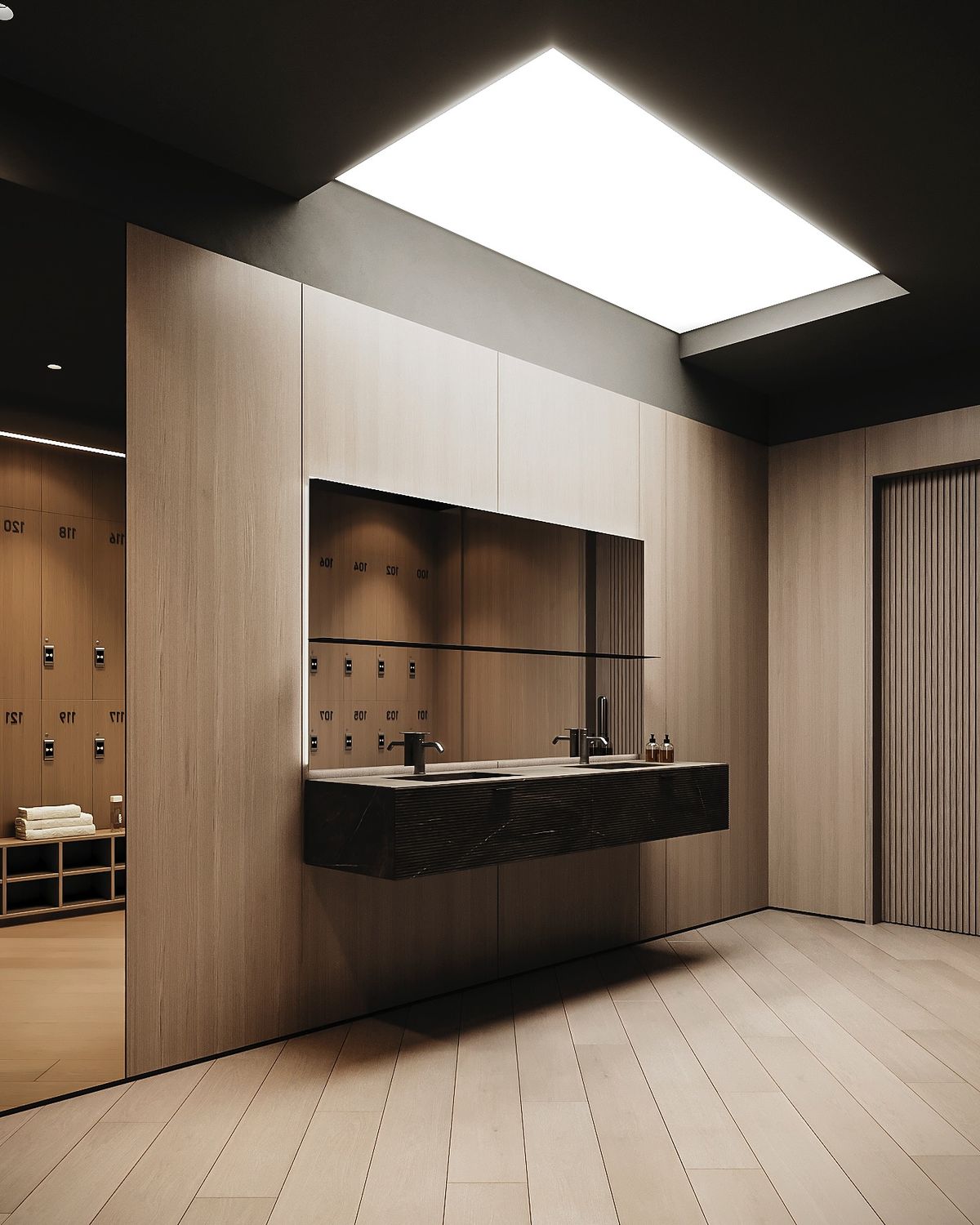 perspective shot a high end luxury gym interior moodboard with a soft minimalist wellness aesthetic focus on refined ceiling design with reduced wood smooth plaster or microcement ceilings combined with geometric backlit panel grids softly glowing diffused ceiling tiles and integrated recessed cylindrical downlights in matte black include subtle sections of light oak only as accents thin slats or trims not dominant walls feature large frameless mirrors spanning full height alternating with soft beige microcement and minimal light wood panel inserts include curved mirrored surfaces and seamless reflective panels to expand space and create depth add integrated niches with warm indirect led lighting flooring is a combination of warm toned microcement and light neutral stone matte finish with minimal wood presence clean seamless transitions between zones lighting is entirely soft and ambient hidden led strips 3000k warm cove lighting backlit ceiling panels and diffused glow surfaces no natural light no windows fully controlled interior lighting environment color palette cream sand warm beige soft taupe matte black accents and reflective glass mirror surfaces style is ultra luxury spa like gym environment presented as an editorial architectural moodboard with material samples mirror plaster stone minimal wood lighting studies and ceiling design focus ultra realistic textures soft shadows 8k resolution