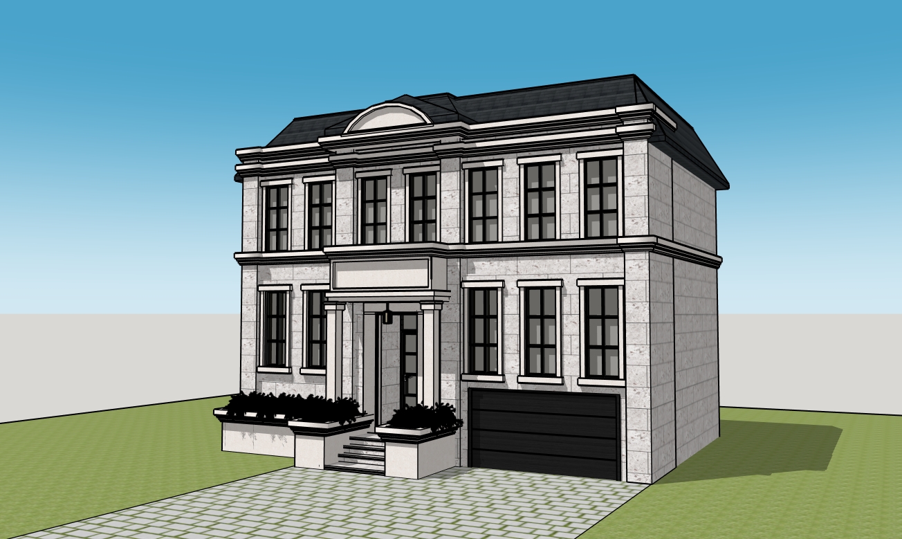 render a photorealistic 3d perspective of this house the house is in limestone light gray with 24 lengths daytime light and reflections on the windows add neighbors each side and natural trees and planters around to show a natural image of a modern and luxury house the trees both side should be smaller as a two car garage is showing in this image