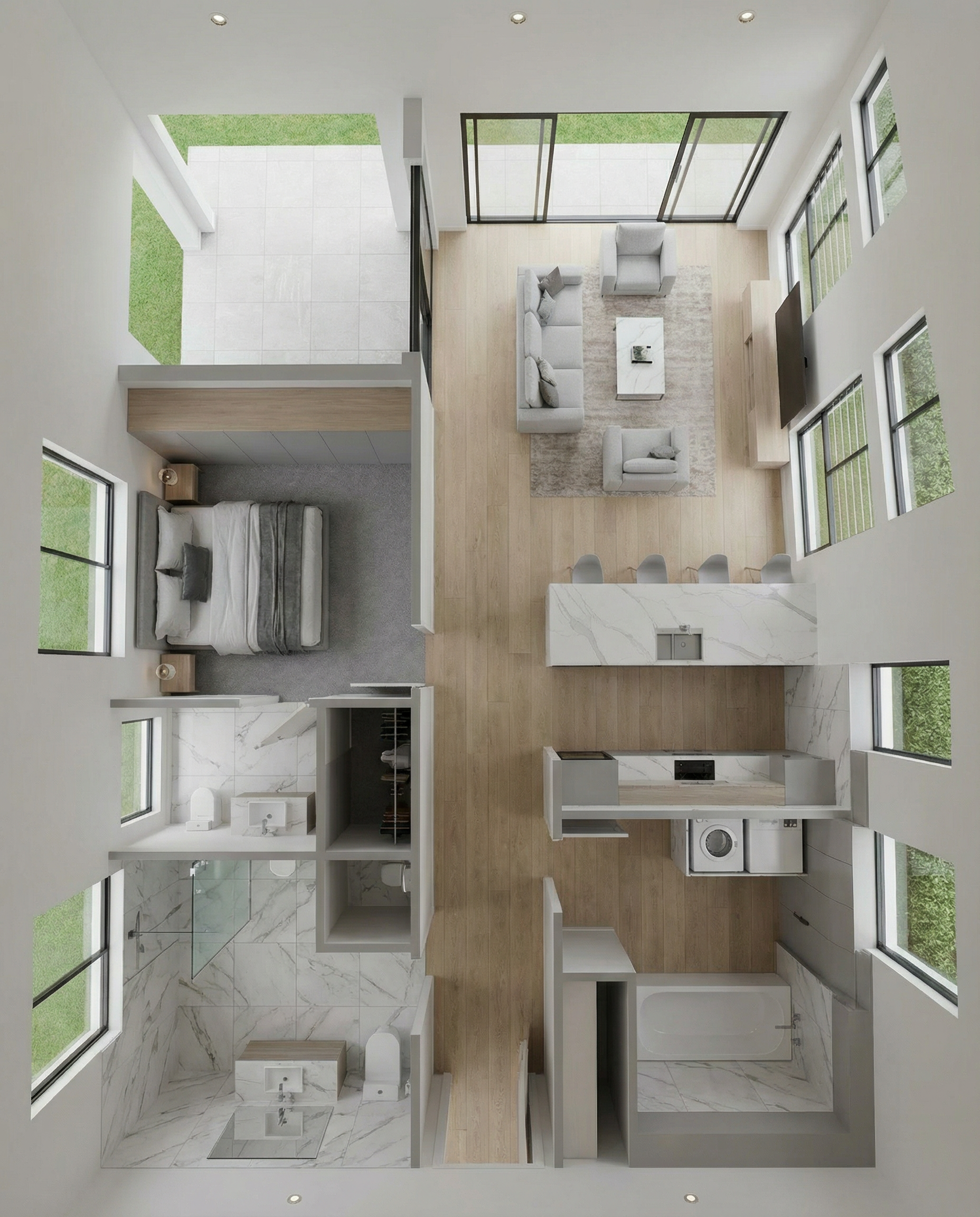 create a high quality photorealistic architectural rendering based on the provided reference image preserving the original architectural design volumes proportions material palette textures and color scheme as shown in the reference image maintain the existing roadway and sidewalk in the foreground exactly as in the reference image including their alignment materials and urban character enhance and refine the existing vegetation with carefully composed planting mature trees layered shrubs ornamental grasses and ground cover improving depth and atmosphere while keeping the architecture visually dominant include a limited number of human figures and a few context appropriate vehicles similar to those in the reference image used strictly to indicate scale and everyday use characters should be discreet well integrated and secondary to the architectural composition use warm natural daylight with realistic shadows soft reflections and atmospheric depth the overall result should be elegant calm and visually appealing a refined architectural visualization suitable for professional presentations competitions and client communication no vegetation in the front as it is the access to parking no grass in the front people should be very few