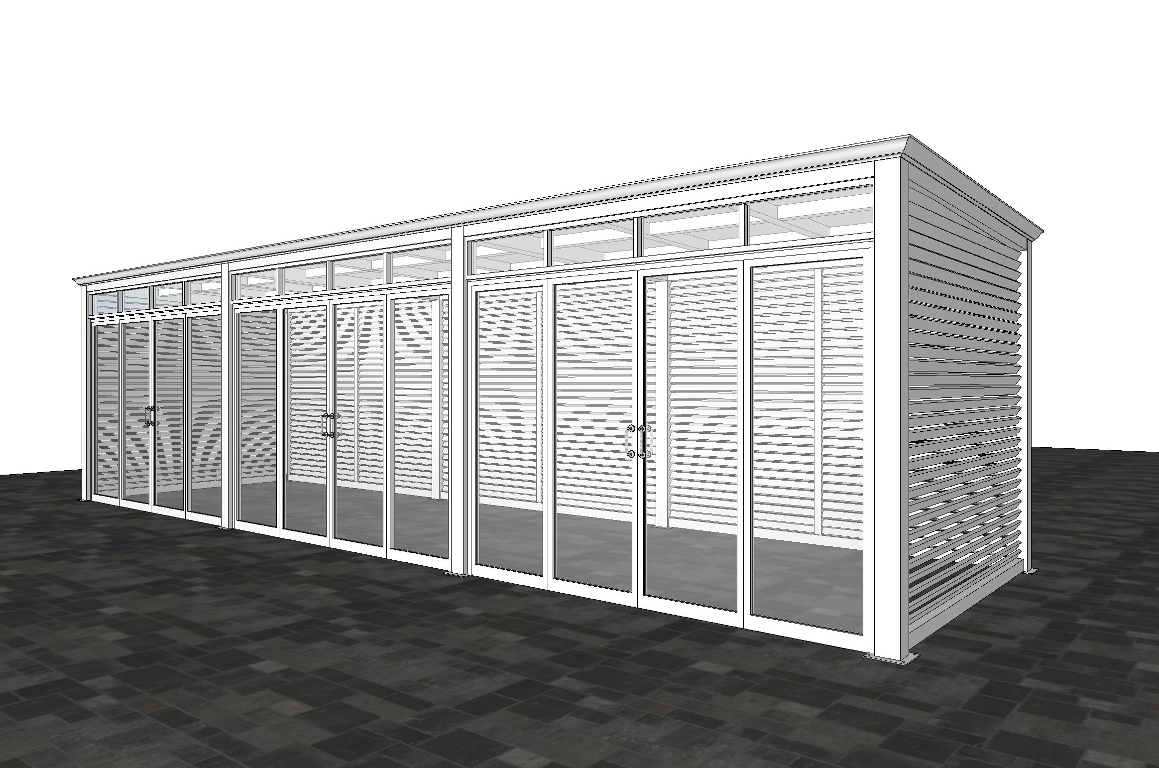 modern outdoor luxury pergola with full height sliding glass doors placed in a high end coastal resort setting in west palm beach florida the structure is contemporary and elegant white aluminum framing clear glass sliding panels with slim handles horizontal exterior louvers on the side walls and clerestory glass panels at the top the pergola interior remains completely empty surround it with a lush upscale tropical environment tall palm trees manicured greenery soft blue sky and bright coastal daylight the ground should be premium outdoor stone or porcelain pavers typical for a 5 star hotel overall feel luxurious serene coastal with warm sun reflections on the glass soft shadows and photorealistic 8k resort quality render