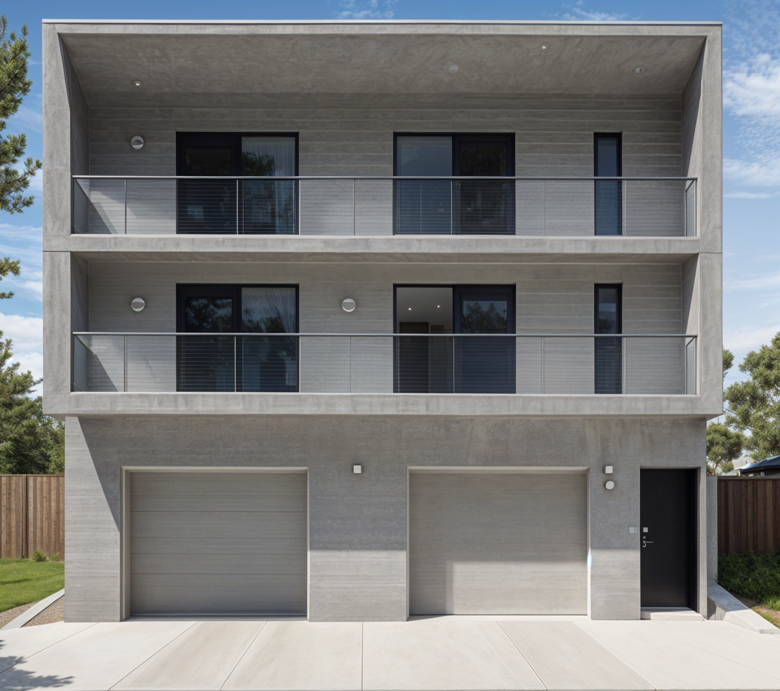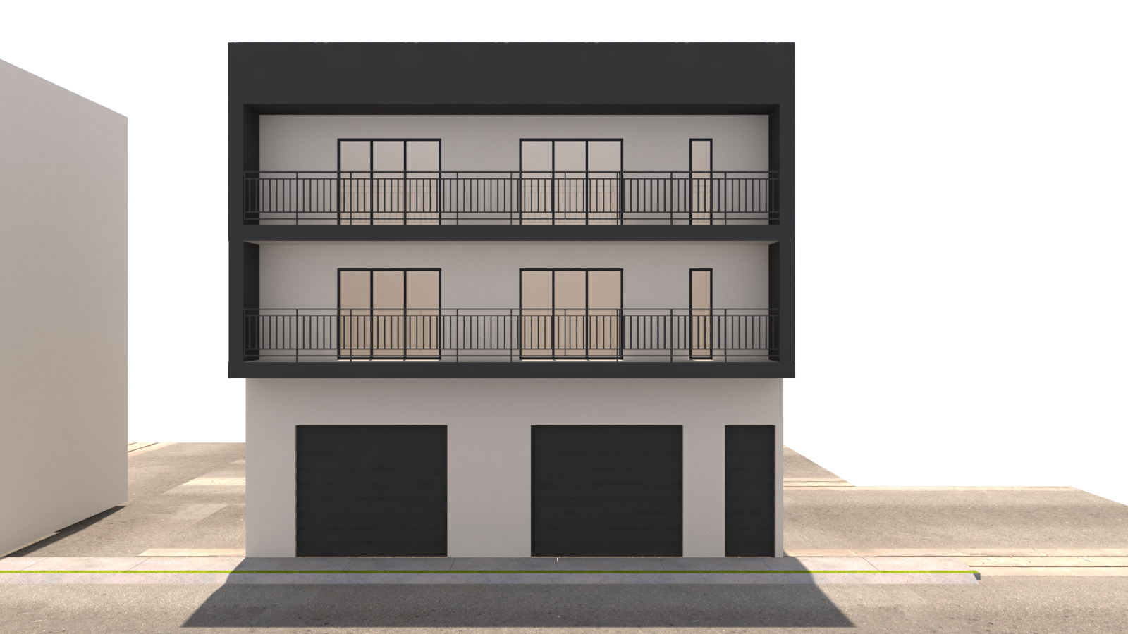 exterior shot render a modern minimalist three story building with a sleek elegant design use a smooth charcoal gray for the exterior structure with deep black for the garage doors and entrance the windows should have clear glass framed with slim black borders and adorned with sheer light curtains the balconies are framed with contemporary steel railings set against a backdrop of bright blue sky with soft white clouds and surrounding greenery with lush green trees the atmosphere should be tranquil and inviting with subtle shadows to enhance depth and realism