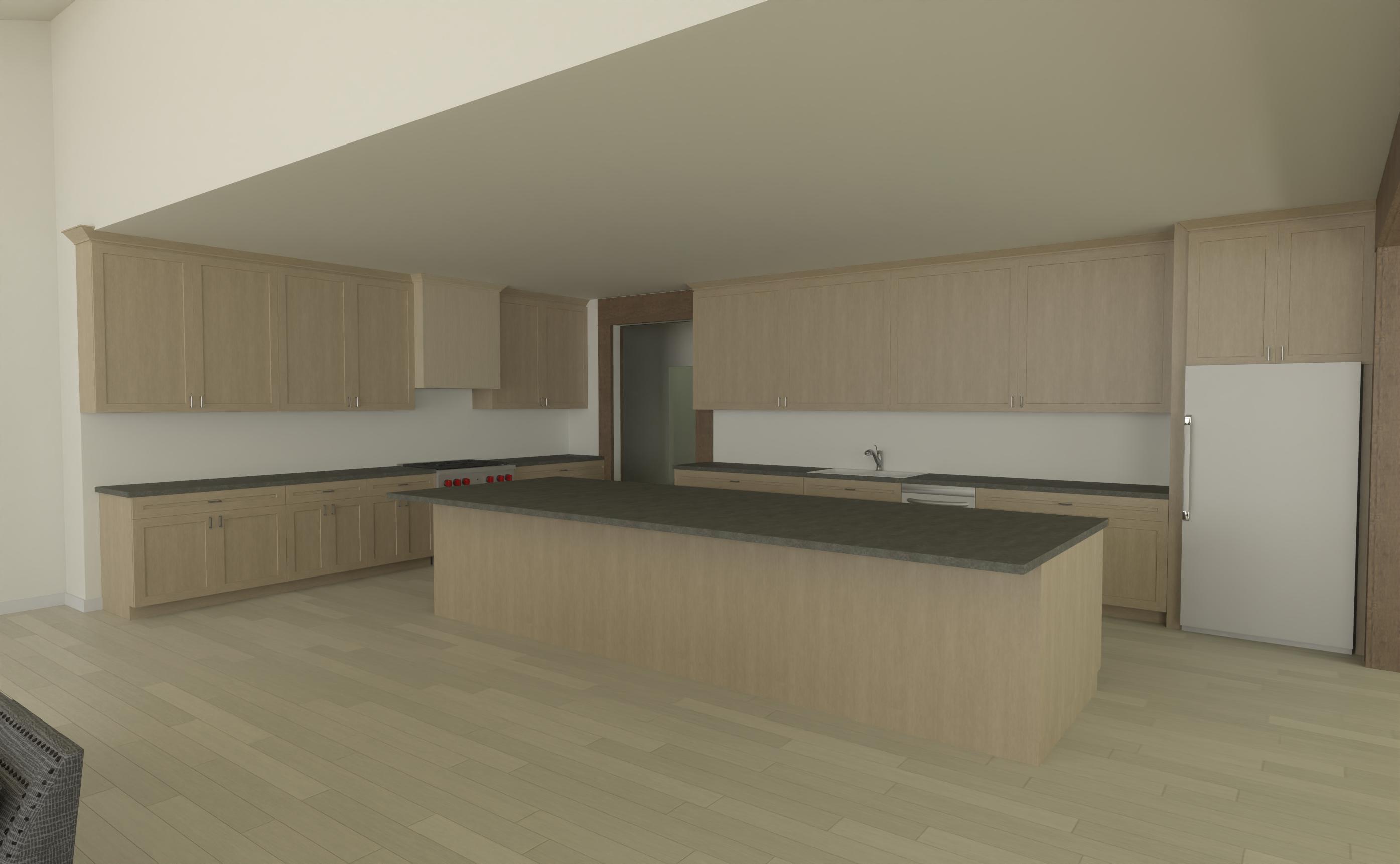 keep cabinet and fixture size the same but change the material to look like a jackson hole house keep the ceilings the same add 5 chairs at island add details like fruit bowls add people add backsplash keep same frame of photo dont add to the frame or take away from the frame