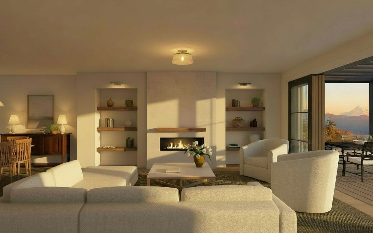 add drapery panels at window wall on left