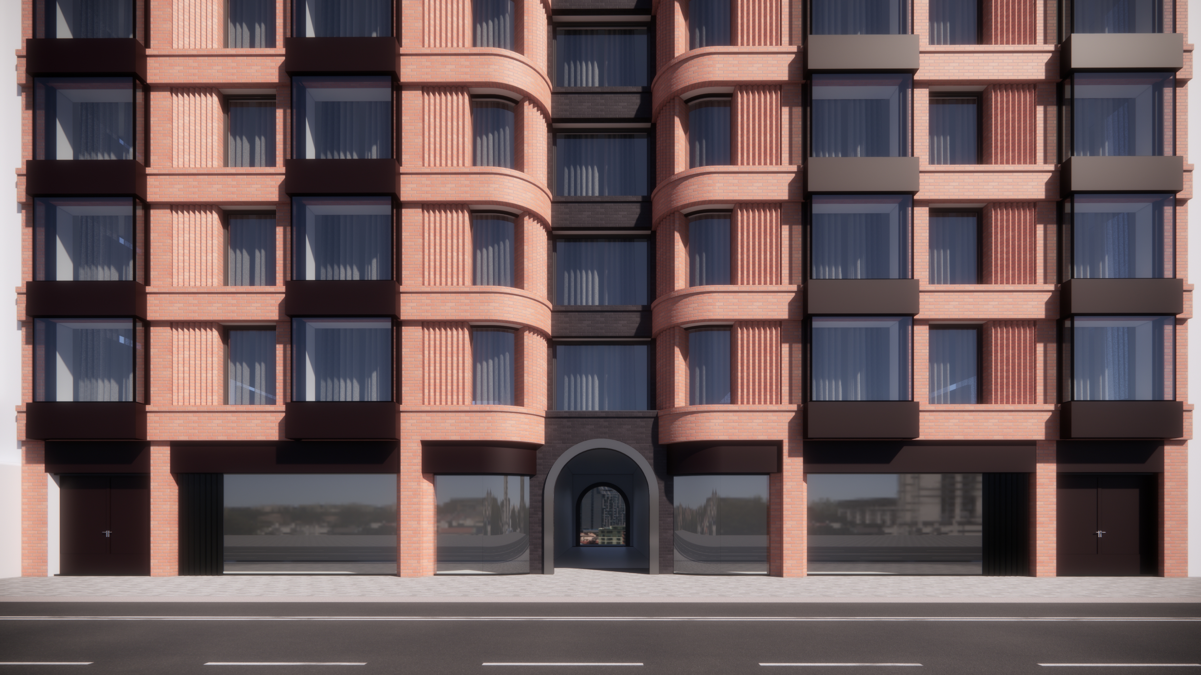 please enhance this image boosted window contrast and reflection street details with pedestrians and subtle improve brick material details upscale the image to hd do not change the geometry