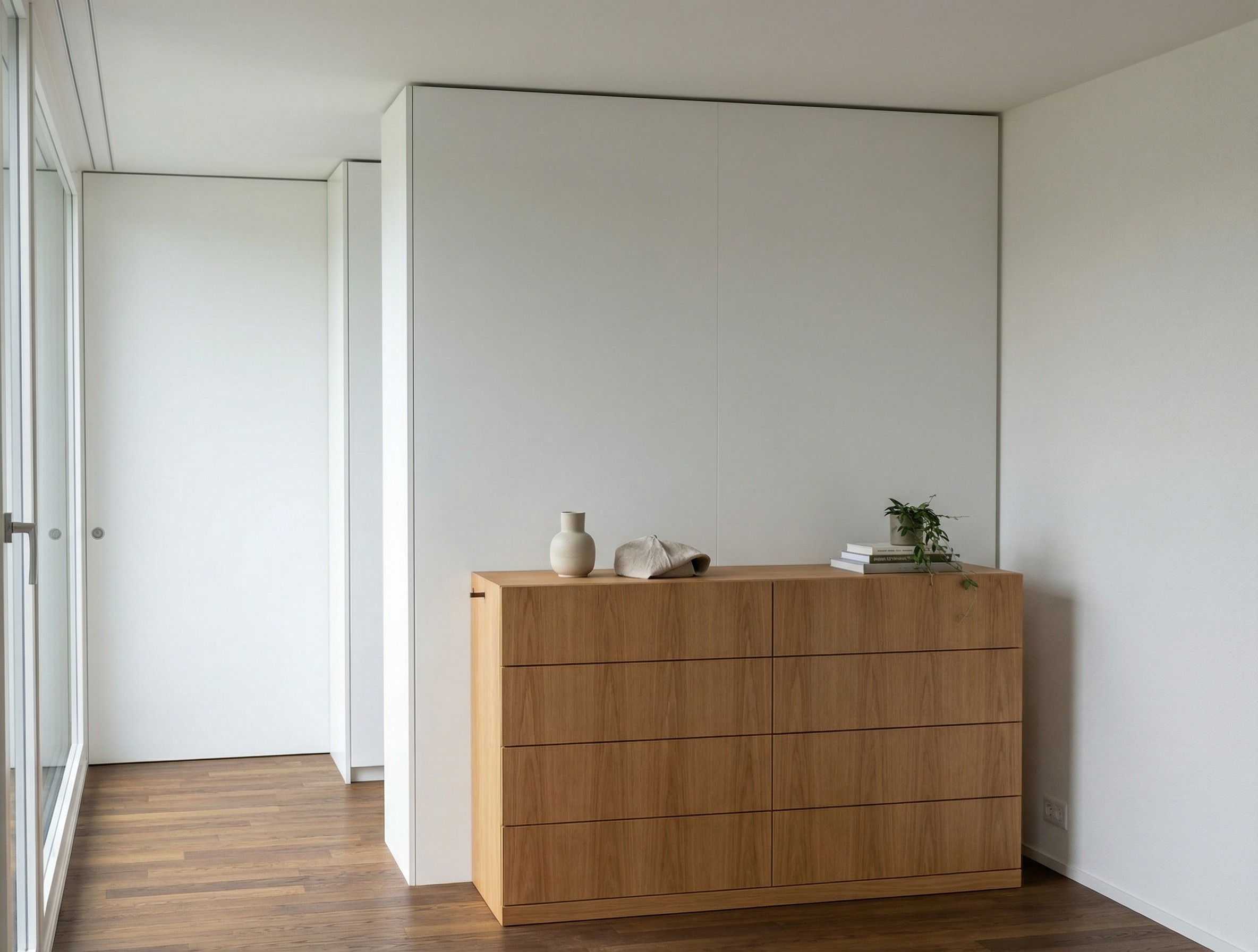 refine this image into a client ready photorealistic architectural visualization strictly preserve geometry proportions layout and camera angle no redesign critical corrections the sideboard must be rift cut oak not cherry neutral natural oak tone remove any reddish hue authentic rift oak appearance linear grain subtle desaturated warmth fine pore structure joinery accuracy correct wood grain orientation on all 8 drawer fronts continuous vertical grain across the entire facade no mirrored or mismatched veneer patterns cabinetmaker realistic veneer alignment material authenticity oak surface ultra matte oiled finish natural micro variation no artificial smoothness floor tobacco brown oak parquet with realistic grain and soft light absorption built in wardrobes cool white super matte lacquer with subtle soft reflections sliding door ral 9010 matte lacquer walls ral 9010 mineral plaster with very fine texture lighting soft lateral daylight from the left window natural light falloff and realistic depth gentle warm bounce from the oak floor avoid showroom or stylized lighting styling minimal calm architectural decoration natural placement not staged rendering intent honest material true architectural visualization suitable for client presentation focus on craftsmanship proportion accuracy and realistic material behavior no ai look no over rendering no dramatic effects