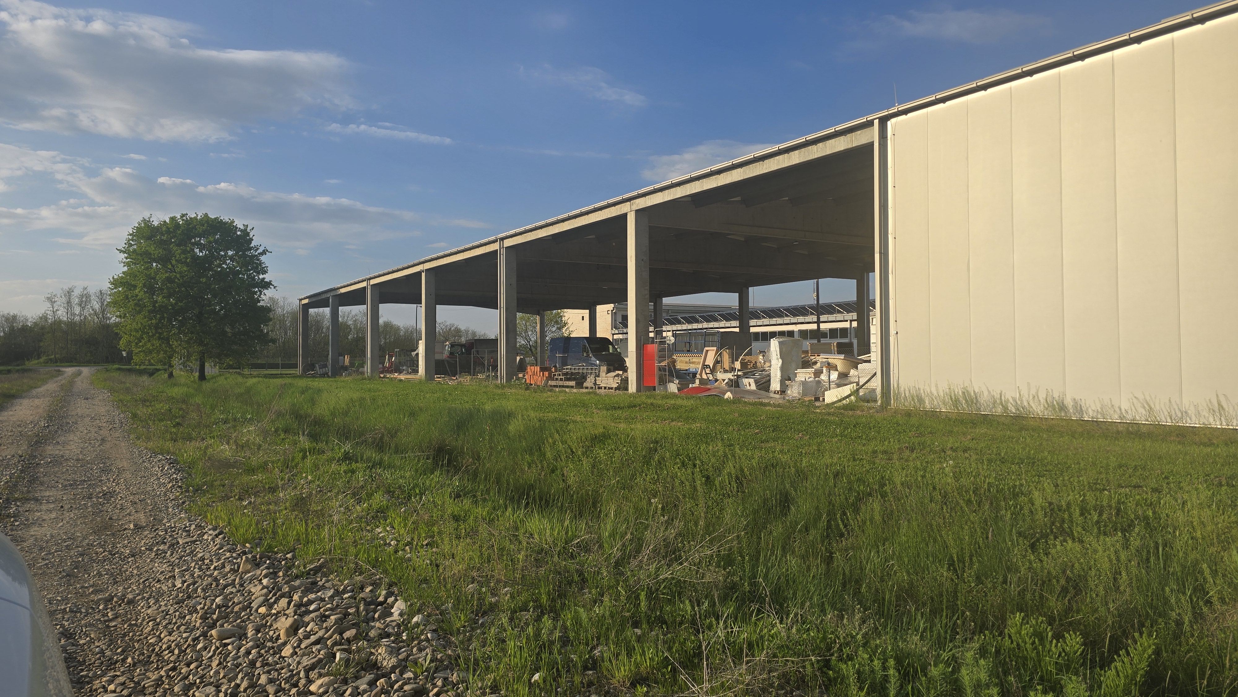 transform this building into a modern luxury wedding hall entrance but do not change the existing structure do not add new walls do not close open sides and do not modify the construction layout keep all columns openings and the current building shape exactly as they are design only the front facade and entrance areas create two identical symmetrical entrances with elegant glass doors and modern canopies add warm led lighting decorative elements and premium materials such as stone wood and dark metal panels but apply them only as surface finishes keep the building open where it is currently open make it realistic modern and suitable for a high end wedding venue