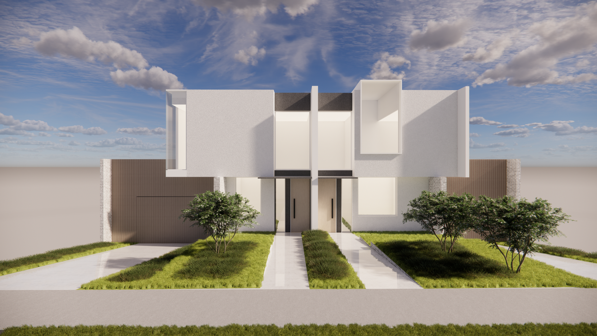 surround the property with a lush dense forest of tall mixed evergreens and hardwoods place the sun behind the trees so warm golden sunlight beams through the branches casting soft rays and subtle dappled highlights across the patio siding and grass create ultra realistic lighting crisp shadows detailed textures in the wood siding and glass reflections and a vibrant clear sky with light atmospheric depth render in hyper realistic architectural visualization quality 8k resolution