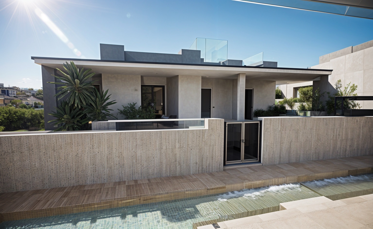 exterior architectural rendering contemporary mediterranean villa soft natural daylight golden hour sunlight white plaster walls local stone cladding 8k render
