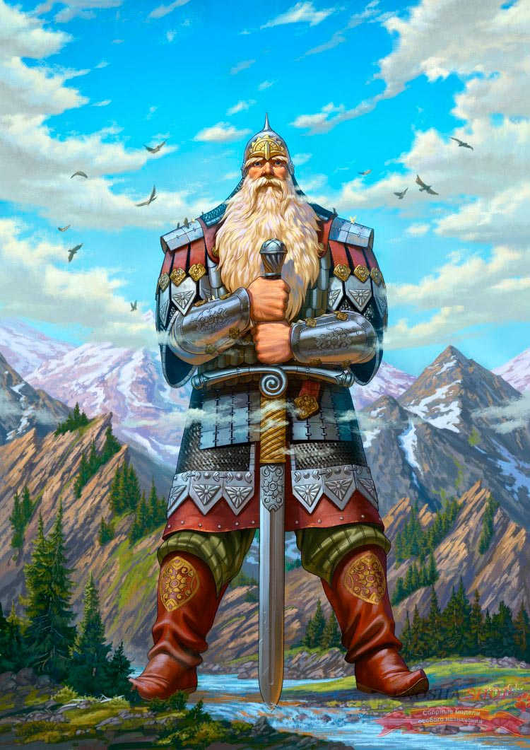 nordic exterior shot statue of a bogatyr made of plastic futurism in white red and blue colors russian architecture