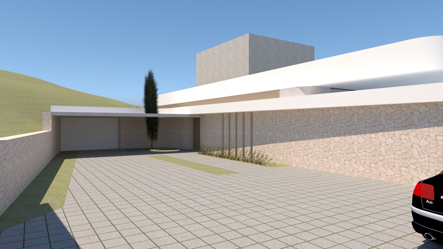 modern luxury hillside villa in tolo greece viewed from a lower eye level angle showing the entrance lighting atmosphere golden hour sunset warm luxurious lighting cinematic sky soft shadows high end luxury villa atmosphere elegant and calm materials exposed concrete white plaster natural stone only on the building large glass panels style photorealistic ultra detailed architectural visualization real estate quality render global illumination better bump and realistick the stone wall