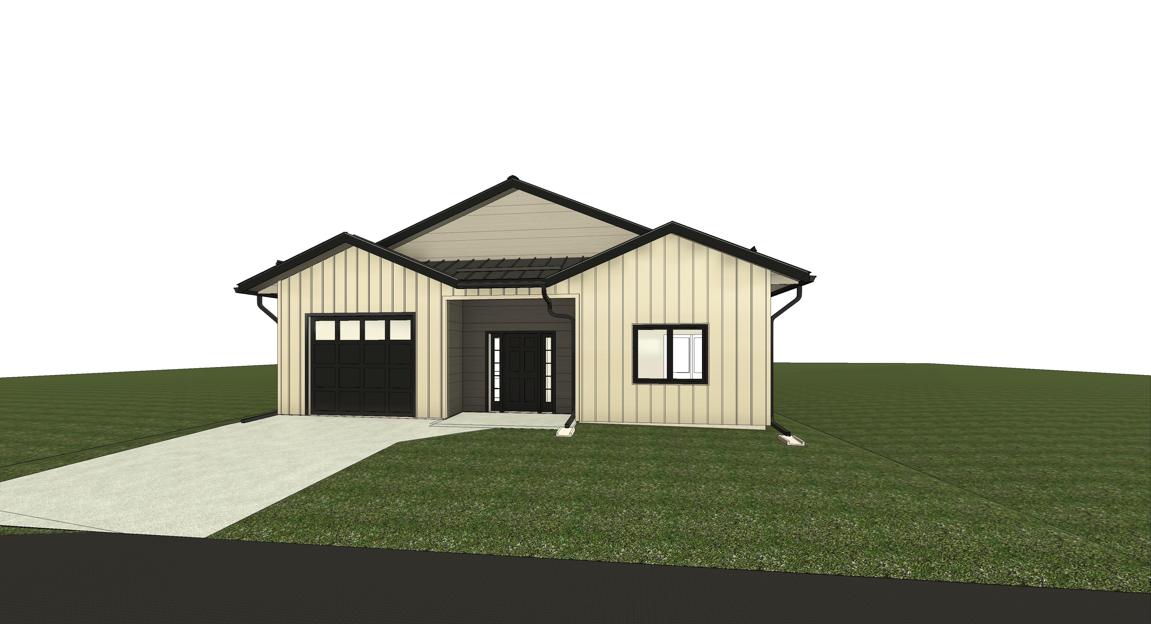 a modern suburban rancher with a combination of lp smartside horizontal lap siding in timberland suede on the upper roof gable as shown lp smartside board and batten in timberland suede as shown and lp smartside horizontal lap siding in bonsai black in the front door entry and side walls as shown black garage door with windows across the top front door is black with glass sidelights as shown black standing seam metal roofing black fascia and black metal soffit retain the exact structure window arrangement rooflines height and proportions exactly as shown in the reference image add a smooth concrete front driveway extending toward the house garage door and a walkway from the driveway to the front door bronze tinted reflective windows enhance materials and colors keep exact window structure arrangement rooflines and proportions exactly as shown in the reference image soft interior lighting inside the home creates warmth the home add address number 26 to the right side of the garage door add exterior lights to each side of the garage door and two pot lights to the covered entry around the property is a few sparse mixed evergreens and hardwoods add some typical yard landscaping such as shrubs flowers rocks etc place the sun out of view casting soft rays and subtle dappled highlights across the front of the home create ultra realistic lighting crisp shadows detailed textures in the wood and glass reflections and a vibrant clear sky with light atmospheric depth render in hyper realistic architectural visualization quality 8k resolution do not change the view angle