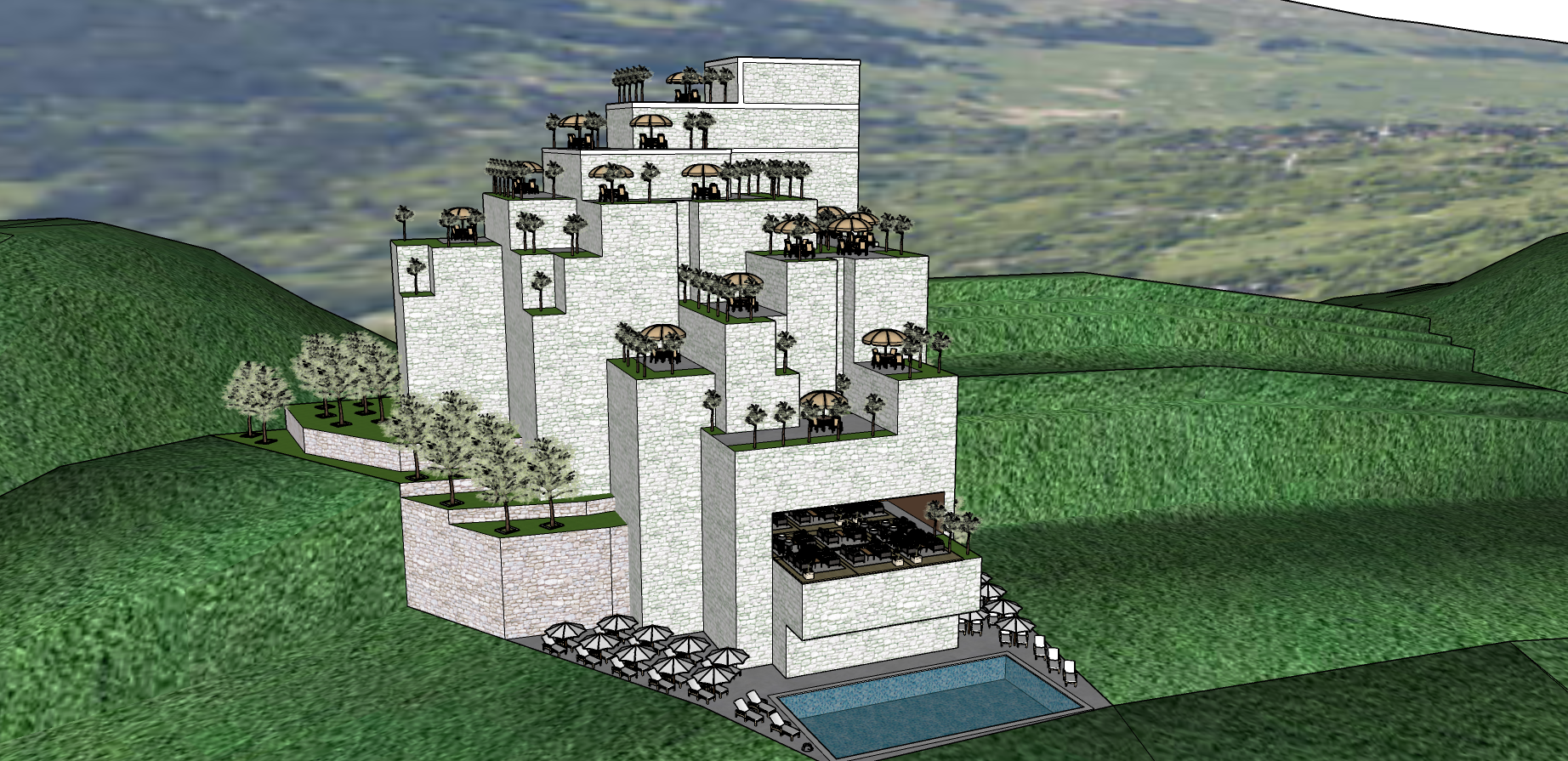render a stunning architectural resort nestled in lush green mountains featuring cascading terraces with light grey stone walls put large tall and wide glass doors overlooking the terraces and also many windows in all the walls windows and doors have to prevail over the facade each terrace is adorned with vibrant green lawns and elegant parasols in soft beige the surrounding trees are a mix of muted silver and deep green foliage incorporate a luxurious inviting pool at the base with clear blue water the atmosphere exudes tranquility and harmony with nature with soft natural lighting emphasizing the serene setting please fill the surrounding hills with olive trees and some houses make it an elite residential zone render a stunning architectural resort nestled in lush green mountains featuring cascading terraces with light grey stone walls put large tall and wide glass doors overlooking the terraces and also many windows in all the walls windows and doors have to prevail over the facade each terrace is adorned with vibrant green lawns and elegant parasols in soft beige the surrounding trees are a mix of muted silver and deep green foliage incorporate a luxurious inviting pool at the base with clear blue water the atmosphere exudes tranquility and harmony with nature with soft natural lighting emphasizing the serene setting please fill the surrounding hills with olive trees and some houses make it an elite residential zone