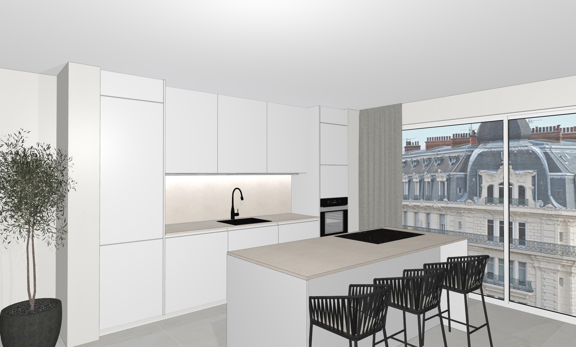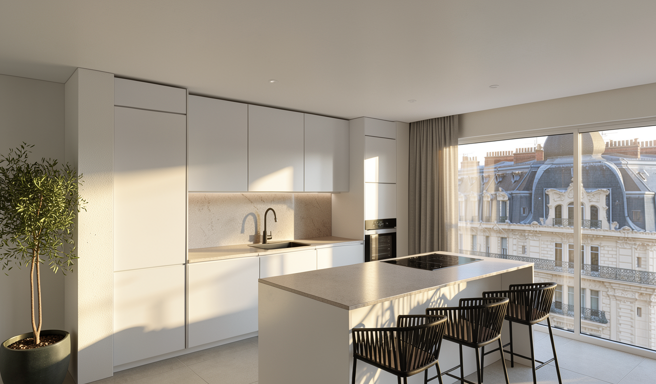 render a modern kitchen interior with a minimalist design the cabinets are sleek and white paired with a light beige countertop a matte black kitchen faucet and sink add contrast include elegant bar stools with black frames and cushion seats complementing the chic d cor a tall lush potted plant with green leaves is placed in a dark grey pot on the left large windows reveal a classic european building with ornate architecture outside the atmosphere is airy and sophisticated with natural daylight streaming in softening the overall scene the floor is a smooth light grey tile enhancing the room s modern aesthetic