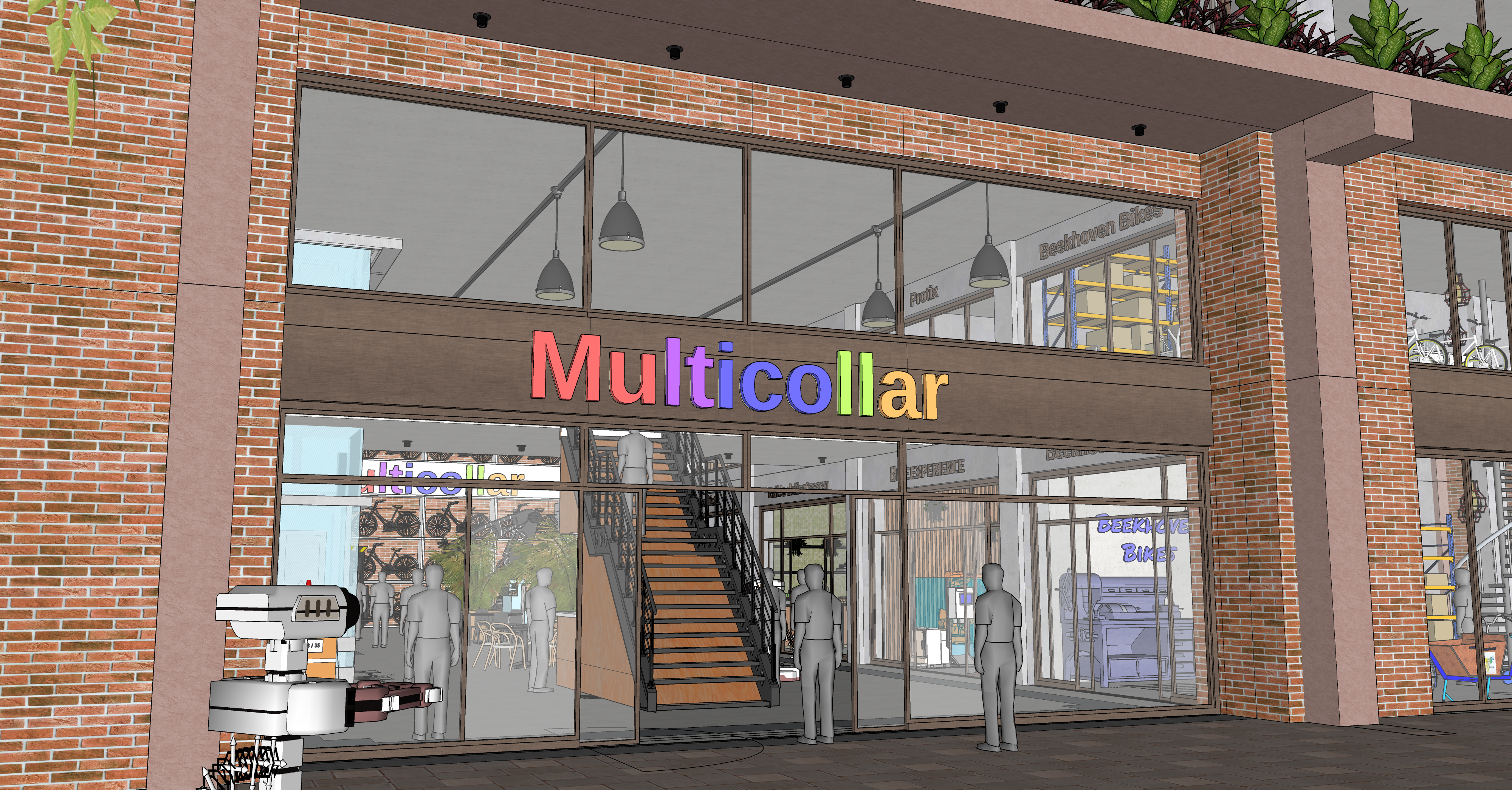 modernist exterior shot modern coworking makerspace people working light colors robots wooden accents warm morning light ambience architecture