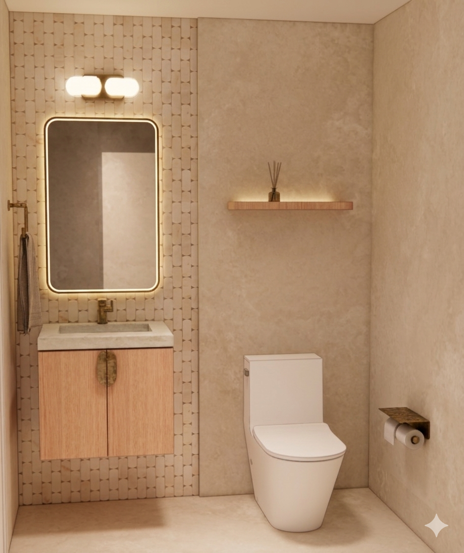 can you make this image more photorealistic while preserving all the materials and colors in the scene change the materials all match to satin brass for the tower bar vanity faucet toilet paper holder change the material of the cabinet pull to travertine do not add or change anything in the space