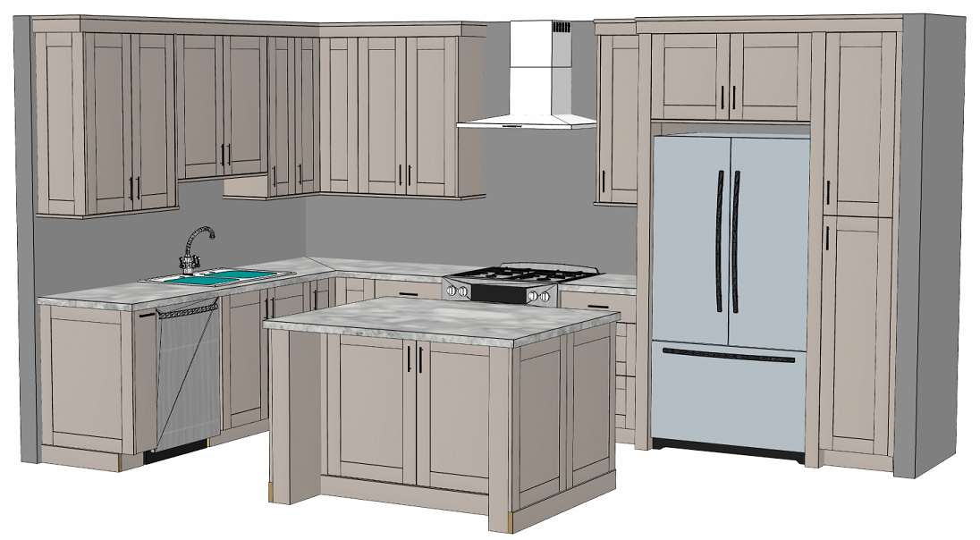 preserve the exact cabinet geometry fillers stiles rails door and drawer proportions toe kicks countertop thickness wall depths and all spacing exactly as shown do not change any dimensions alignment reveals or positions do not reinterpret or redesign the cabinetry or walls do not alter any colors or materials only enhance realism by smoothing lines improving lighting and shadows and giving the image a clean photo like appearance while keeping the entire design completely unchanged