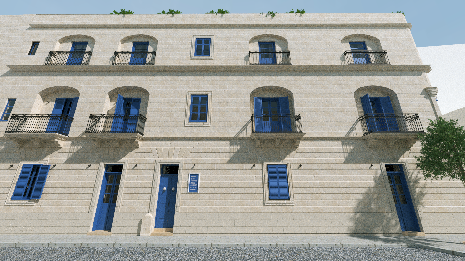 make it more realistic retain black railing at the terraces add few people blend similar building in background fully restored maltese house 118 years old