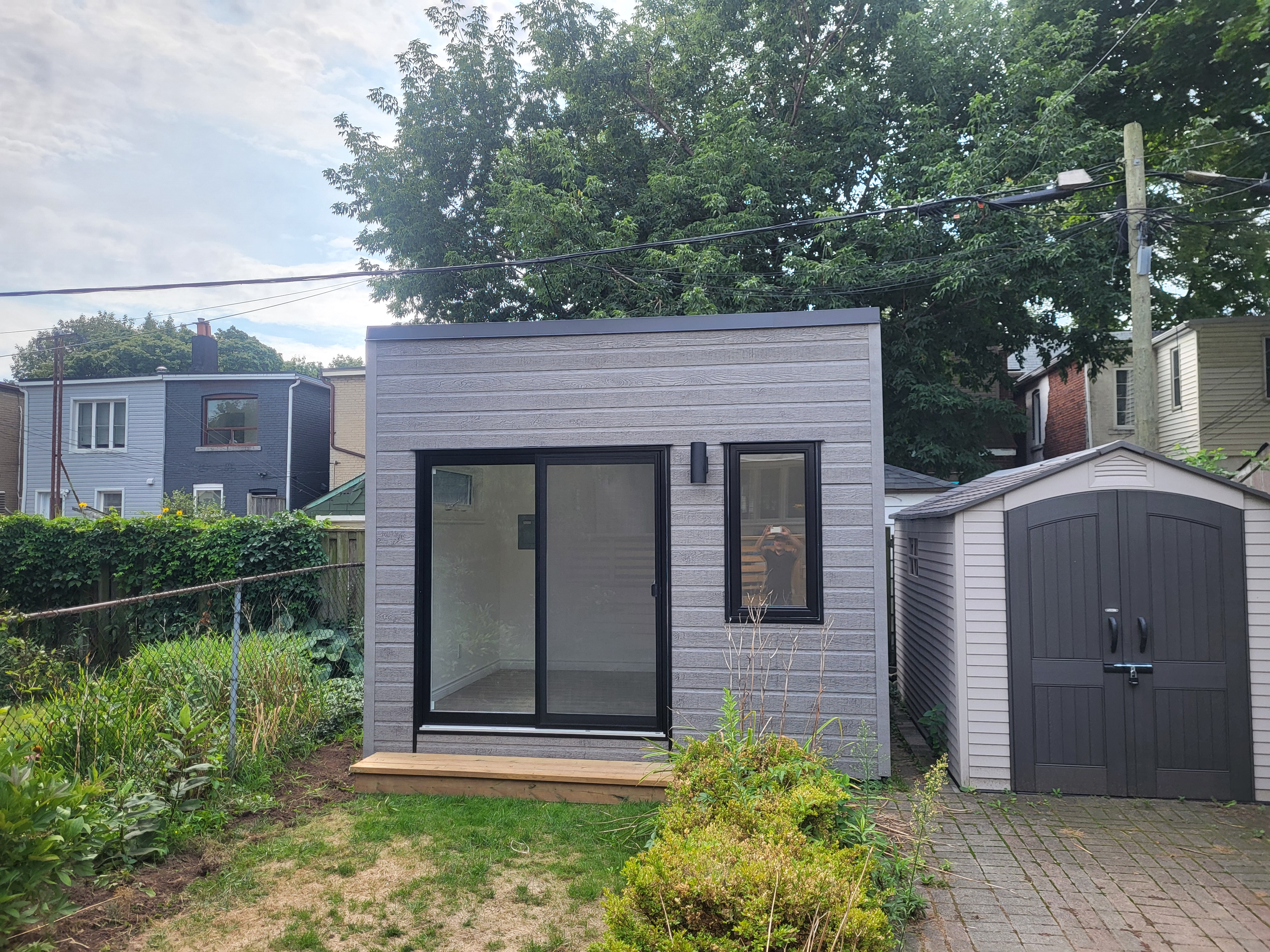 modernist exterior shot add chairs and flowers to the scene architecture