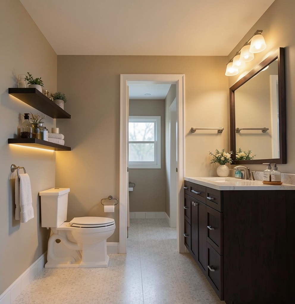 accessorize this bathroom and make the lights look like they are on do not add lights below floating shelves do not add lights below floating shelves