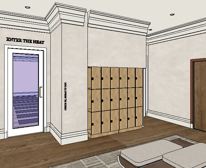 add an ipad for pilates check in and the glass door is an entrance to a pilates matt and yoga studio keep the exsisting view through the door flush the molding and close the gap between the wood lockers and wall