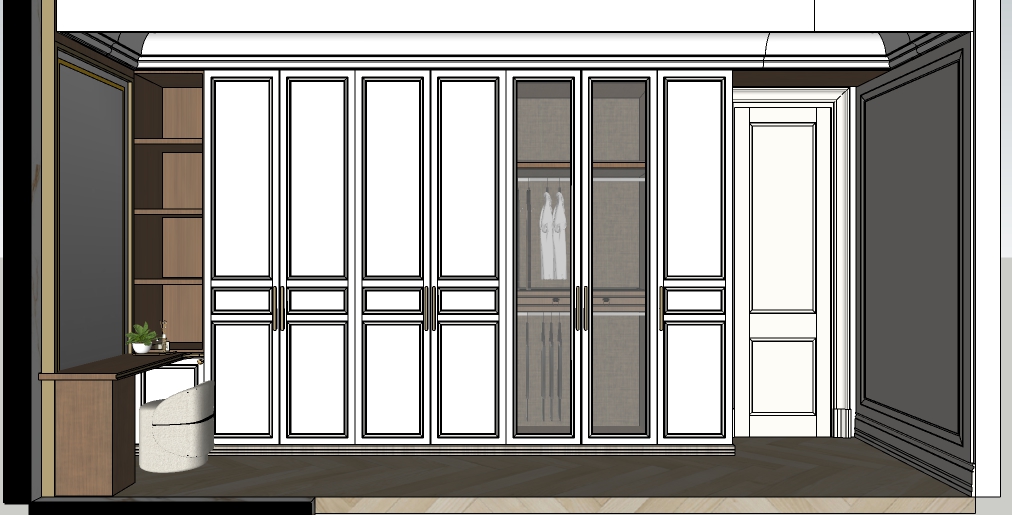 render senyata mungkin dengan ambien cahaya off white warna lemari polos krim dengan kaca coklat tembus dan material kayu coklat dengan lantai harringbone vinyl krim di meja rian ada cermin yang ada indirect light di cerminnya