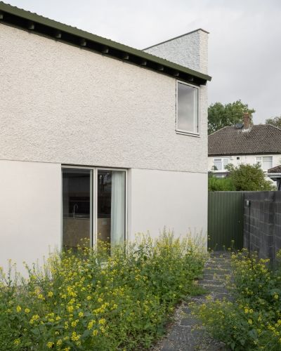 exterior shot a rough plaster structure in beige a single standing house no stairs