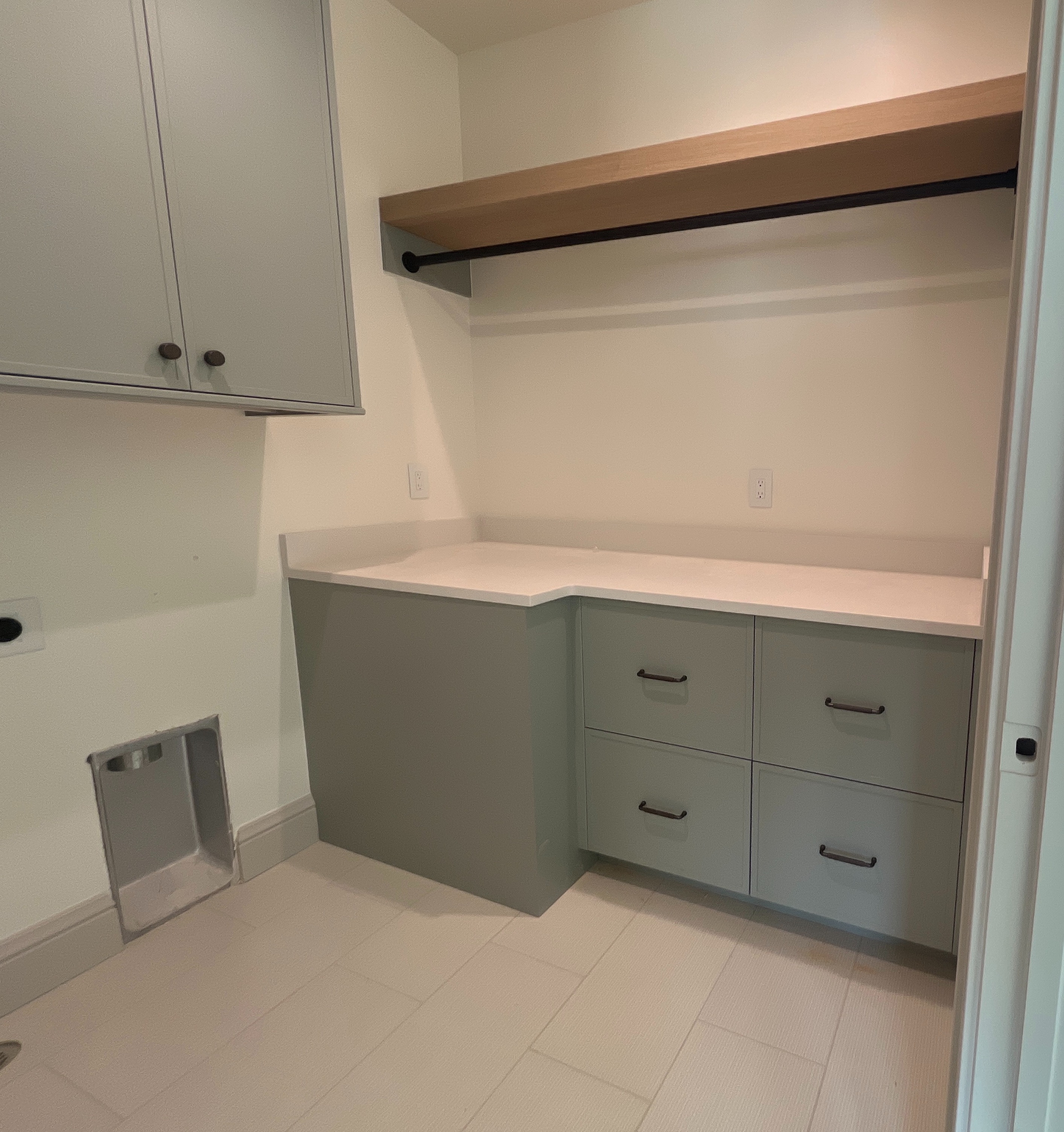 do not change the cabinets at all preserve the exact cabinet colors materials finishes door style drawer style hardware proportions reveals geometry and alignment exactly as shown do not alter the countertop flooring walls ceiling angles perspective lighting direction appliances or any architectural elements keep the camera viewpoint absolutely identical only remove clutter construction materials and unfinished areas clean the room and make it look fully finished add only minimal tasteful staging items appropriate for the space such as a small plant or a folded towel do not add any furniture or change anything about the cabinets countertop or room structure negative constraints no cabinet changes no perspective changes no angle changes no color changes no resizing no shape changes no geometry changes no filler changes no hardware changes no new cabinetry no wall changes no added shadows that distort structure add a washer and dryer on pedestals below the upper cabinets stage for a laundry room and hang a couple of clothes on the closet rod do not change the cabinet layout at all