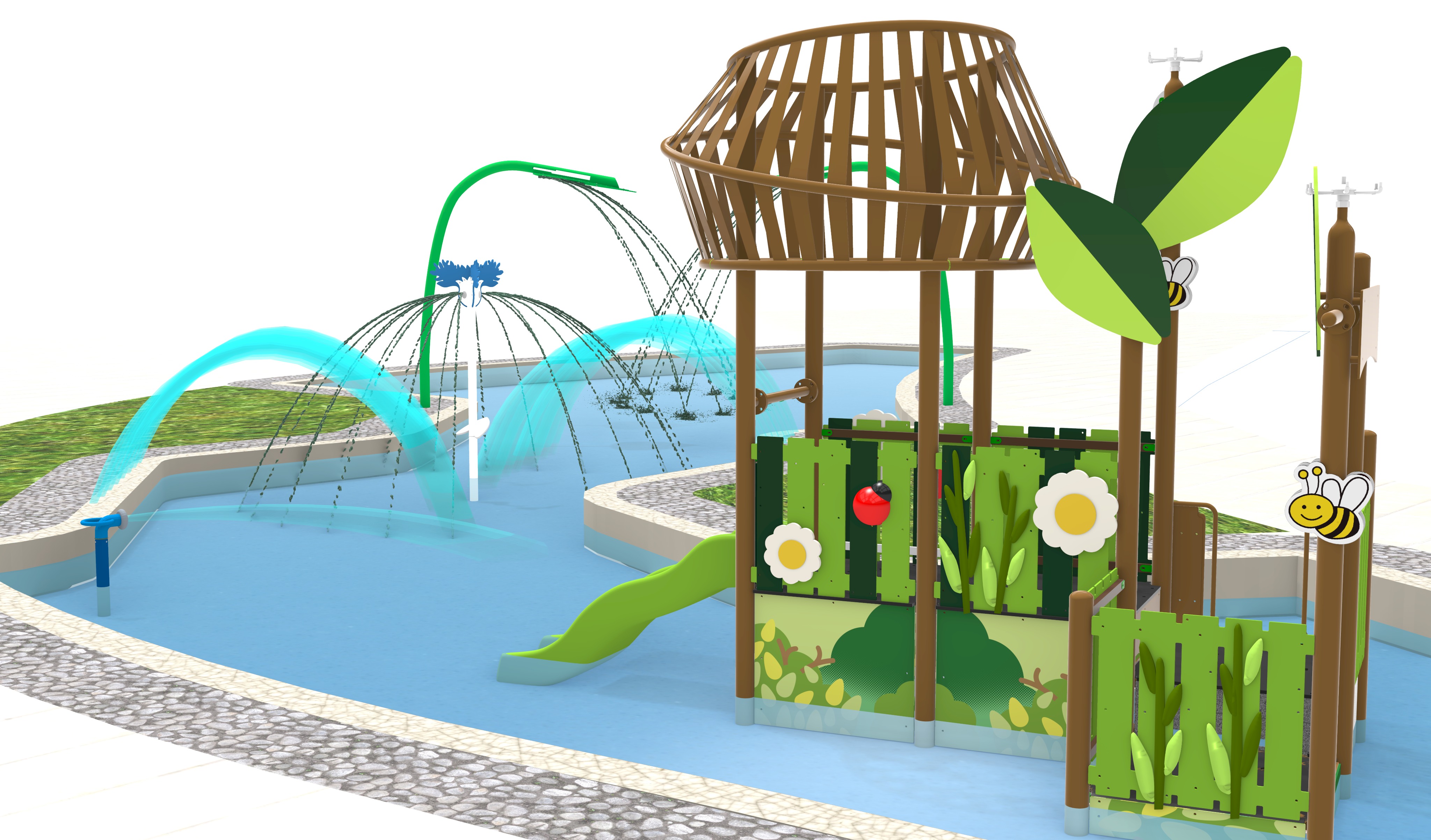 hyper realistic architectural render of a bustling outdoor children s pool area within thomson view condo at singapore suitable for a luxury magazine feature do not add any playground structure or playground flooring other than what is given visual foundation composition the overall scene composition camera angle and surrounding outdoor elements like implied landscaping are inspired by singapore park outdoor environment details the setting is clearly outdoors with lush well maintained landscaping surrounding the playground this includes tasteful trees and shrubbery that frame the scene without obstructing the playground the ground beneath and around the playground should be appropriate for an outdoor play area e g safety surfacing grass do not change the colors and design present in the given play area flooring vibe lighting liveliness the lighting replicates a vibrant high day time with directional light primarily from the top left creating rich highlights only making soft shadows no harsh shadows accepted the scene is exceptionally lively and bustling populated with a greater number of diverse children actively and dynamically playing on and around this specific playground model climbing sliding interacting adults are also present supervising or engaging in relaxed interaction within the well landscaped area the atmosphere is highly energetic happening and refined all materials and textures wood metal safety surfacing foliage building facades are rendered with a 4k uhd level of hyper realism and tactile quality matching the previous luxurious aesthetic output quality the final image should be clean free of watermarks and convey a premium aspirational quality