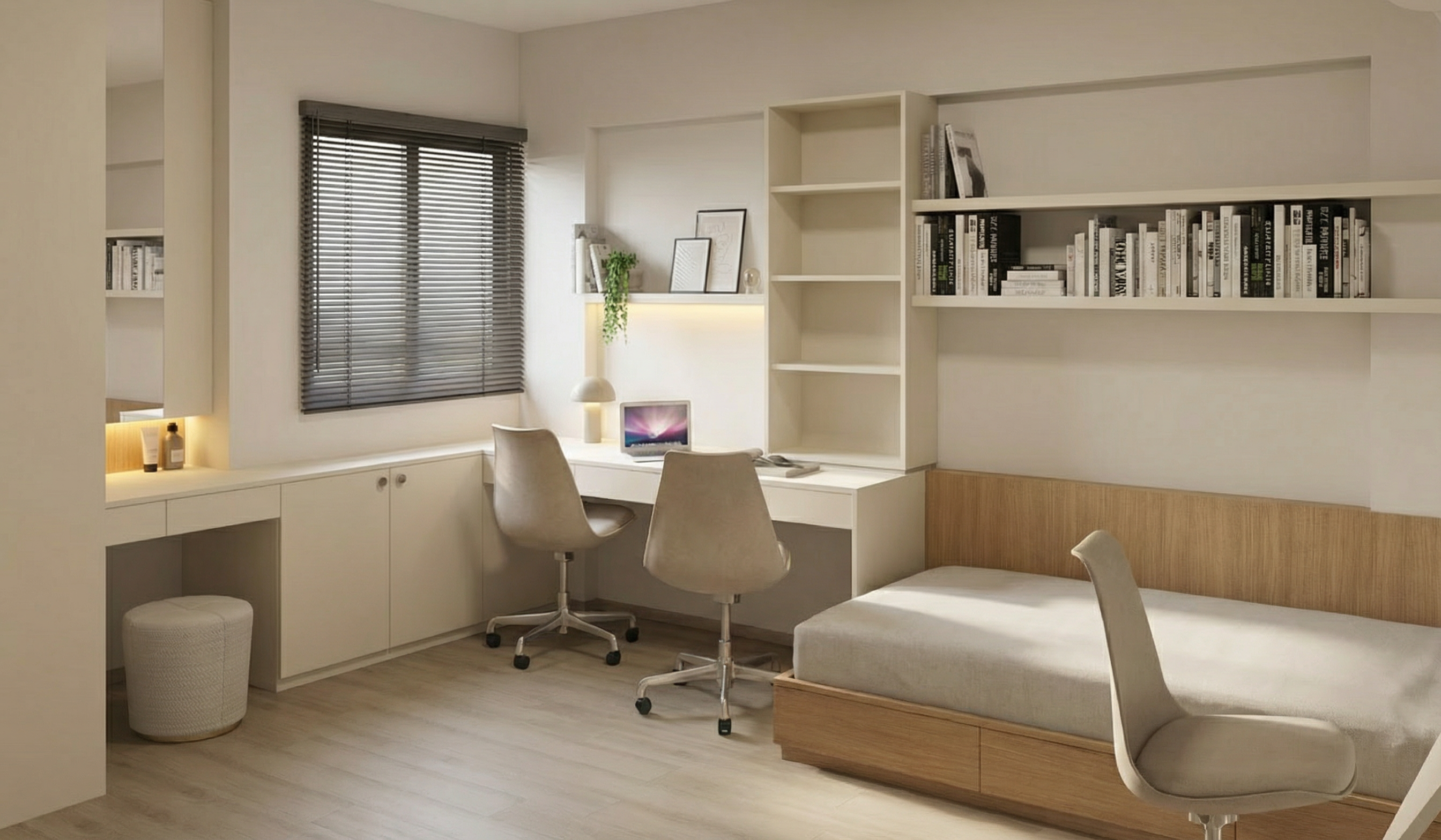 colours and texture to remain accurate as per given picture floor in light beige brown vinyl wood texture subtle bed frame and headboard to be in light mid brown other carpentry in cream white led strip on left shelf only one wall in light brown colour