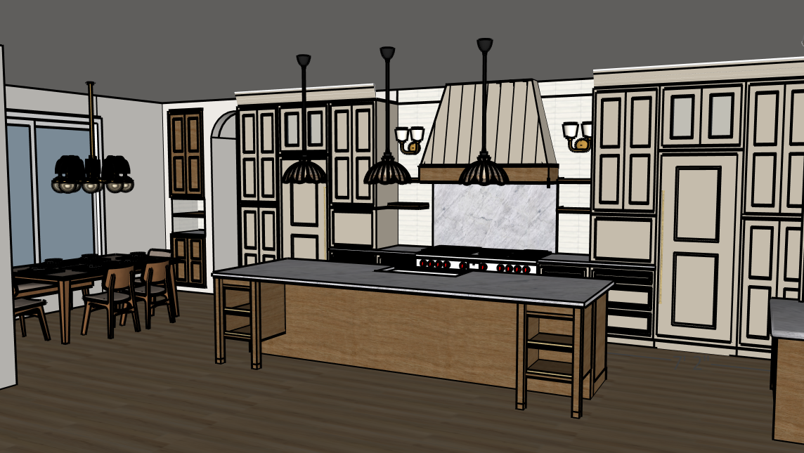 a beautifully rendered kitchen interior with a warm and inviting atmosphere use soft taupe for the shaker style cabinetry and white tones for the walls the kitchen island features rich wooden textures in medium walnut for a classic touch contrasted with a smooth white and grey marble countertop incorporate elegant cream linen pendant lights to hang over the island casting a cozy ambient glow add brass cabinet hardware and brass sink faucet the flooring is a light natural wood adding warmth to the room create a well lit airy setting with natural light streaming through highlighting the intricate details and creating a comforting contemporary space