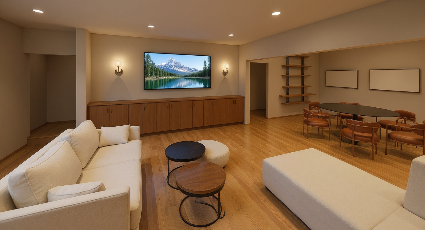 white oak flooring with cream upholstery furniture add picture to tv screen on a brick wall behind tv add whiskey bottles to rack clear glass dining table