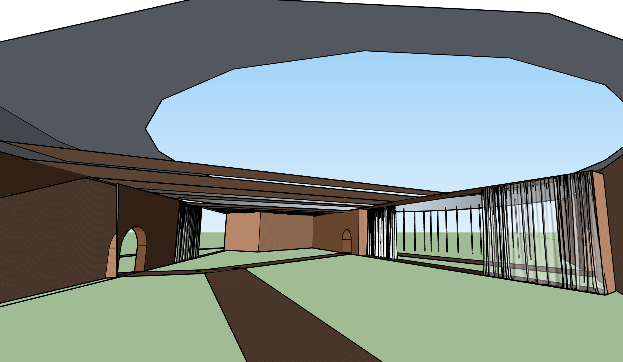 sustainable design interior shot exerior part of visitor center from wood and corten steel there are also colums that are working as a curtains but look like columns in the photo i gave you they are white vertical the pathways are wooden and the ground is mostly gravel and also old grass make it 100 accurate to the photo i gave you do no add nothing new just render what you see there are no glass rooms and there are two arched vaults that work as a door keep it simple and same architecture