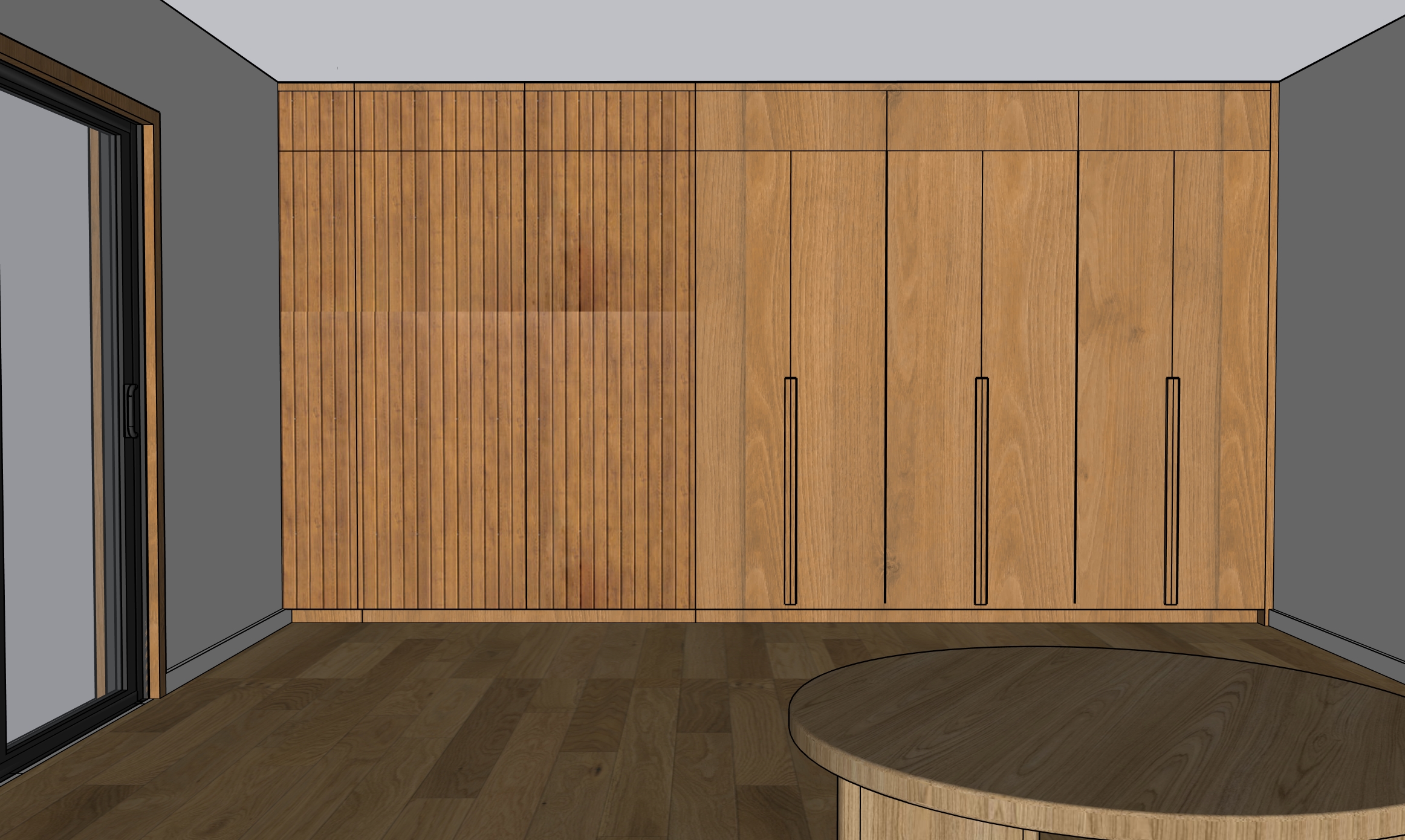 make wood colour tone a bit lighter and more like white oak wood add natural light coming from sliding door